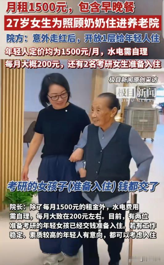 “27岁女子每月花1500住养老院,是种什么体验?!”浙江乐清,女子小小年纪,就选择花钱住进养老院,每月只需要平摊200元左右的电费不说,更绝的是还能提供早晚两餐。要知道老人入住的标准是每月3000元,这到底是怎么一回事呢? 光明网十月十号报道了这则女子为陪家里的老人,住进养老院后,发现这里比租房还划算,甚至还能提供两餐的新闻,不过这背后的真相更是让人敬佩! 小丽在上班时突然接到了养老院的电话,对方表示是她奶奶想和她聊几句。 不明所以的小丽从工位上离开,走到楼梯间后和奶奶聊了起来,刚开始奶奶不停地询问孙女最近的生活和工作情况,让她别太累了。 聊着聊着奶奶话题一转,小声问小丽能不能多来养老院陪陪她,自己在这里太孤独了。 闻言小丽的声音瞬间哽咽起来,连忙答应了奶奶的请求,并表示明天就先请假过去一趟。 挂断电话后小丽自责了很久,想起自己自打记事起爸妈就特别的忙,从小到大都是奶奶陪自己长大的,自己也忘了上次去看奶奶的情景了。 第二天小丽买了一大堆奶奶爱吃的食物后赶到养老院,看到孙女的到来奶奶先是一愣,随后就开心的笑了起来。 小丽陪着奶奶说了会话后,又带她出去散步,回来后又开始喂奶奶吃好吃的,一整天下来后奶奶的气色明显好了很多。 注意到奶奶的变化后,小丽默默地做了一个决定。 小丽送奶奶去休息后就找到院长办公室,提出了希望住进来陪奶奶的想法。 闻言院长很是意外,毕竟很少有年轻人愿意来这里的,连这里的护工和工作人员,大都是40岁以上的中年人。 得知小丽的初衷后,院长大大方方的同意了她的请求,毕竟这里是新建的养老院,一共有6层楼,很多房间都空着呢。 这里正常的收费标准是3000元每月,念在小丽一片孝心的份上,院长直接给了半价的优惠,每月只需要1500元,每天还供应早晚餐,虽然水电费平摊,但算下来每月也就200元左右。 闻言小丽十分开心,每个月1700元就能租到这种环境的单间,简直是赚大发了,而且这里交通便利,不远就有公交车。 小丽也将这个好消息分享给了奶奶,老人更是开心的合不拢嘴。 就这样小丽马上安排退租后搬了进来,院长还专门将房间安排在了奶奶的隔壁,这下子两人既不互相打扰,又能随时随地的串门了。 事情发到网上后很快引起了网民的兴趣,特别是很多交着高价房租的年轻人有了想法:这里1500一个月,算上水电200元,加起来也才1700元,但这是单间不说,关键还管早晚2顿饭,这对那些不会做饭、只会点各种外卖的年轻人来说,诱惑力不要太大。 院长见一直有人咨询此事,最后更是决定空出来一整层楼,用来接待这些有需求的年轻人,且统一定价1500元,水电费平摊。 至于为什么年轻人半价,院长表示年轻人每天只是过来休息,没有享受养老院提供的其他服务,加上现在空房很多,也就无所谓了。 不得不说这个想法真是神来之笔:养老院的老人需要年轻人的活力和激情,年轻人则需要一个更加实惠和便利的住所,此举堪称双赢,值得推广! 目前已经有2个准备考研的女孩子,过来考察后相当满意,直接交钱准备入住了。 那么,从法律角度,如何看待这件事呢? 1、如何评价小丽入住养老院的行为? 根据《民法典》第五条的明确规定:民事主体从事民事活动,应当遵循自愿原则,按照自己的意思设立、变更、终止民事法律关系。 该事件中小丽入住养老院的行为,是出于相方自愿的一般民事合同行为,这意味即使养老院的主要服务人群是老年人,只要双方协商一致,且遵循自愿的基本原则,小丽的行为就是合法合规的,受到法律的保护。 2、如何评价养老院的行为? 根据《老年人权益保障法》第十三条规定:根据老年人养老以居家为基础,家庭成员应当尊重、关心和照料老年人,逐步改善保障老年人生活、健康、安全以及参与社会发展的条件,实现老有所养、老有所医、老有所为、老有所学、老有所乐。 养老院的宗旨就是给老人提供一个优良居住场所,保障老人的饮食和健康,但因为没有亲情的陪伴,导致很多老人郁郁寡欢,养老院允许奶奶的孙女小丽入住,明显改善了对方的心理健康情况,完全符合上诉法律提倡的老有所养、老有所乐的基本原则。 此外,养老院决定引进更多年轻人的行为,更是合法行使自身经营权的基本体现,这不仅能解决空房闲置浪费的问题,这种“陪伴型入住”的创新方式,更能直接提升老年人的生活状态和心情,资源也能得到最大化的利用。 那么,对于这种养老方式你怎么看?