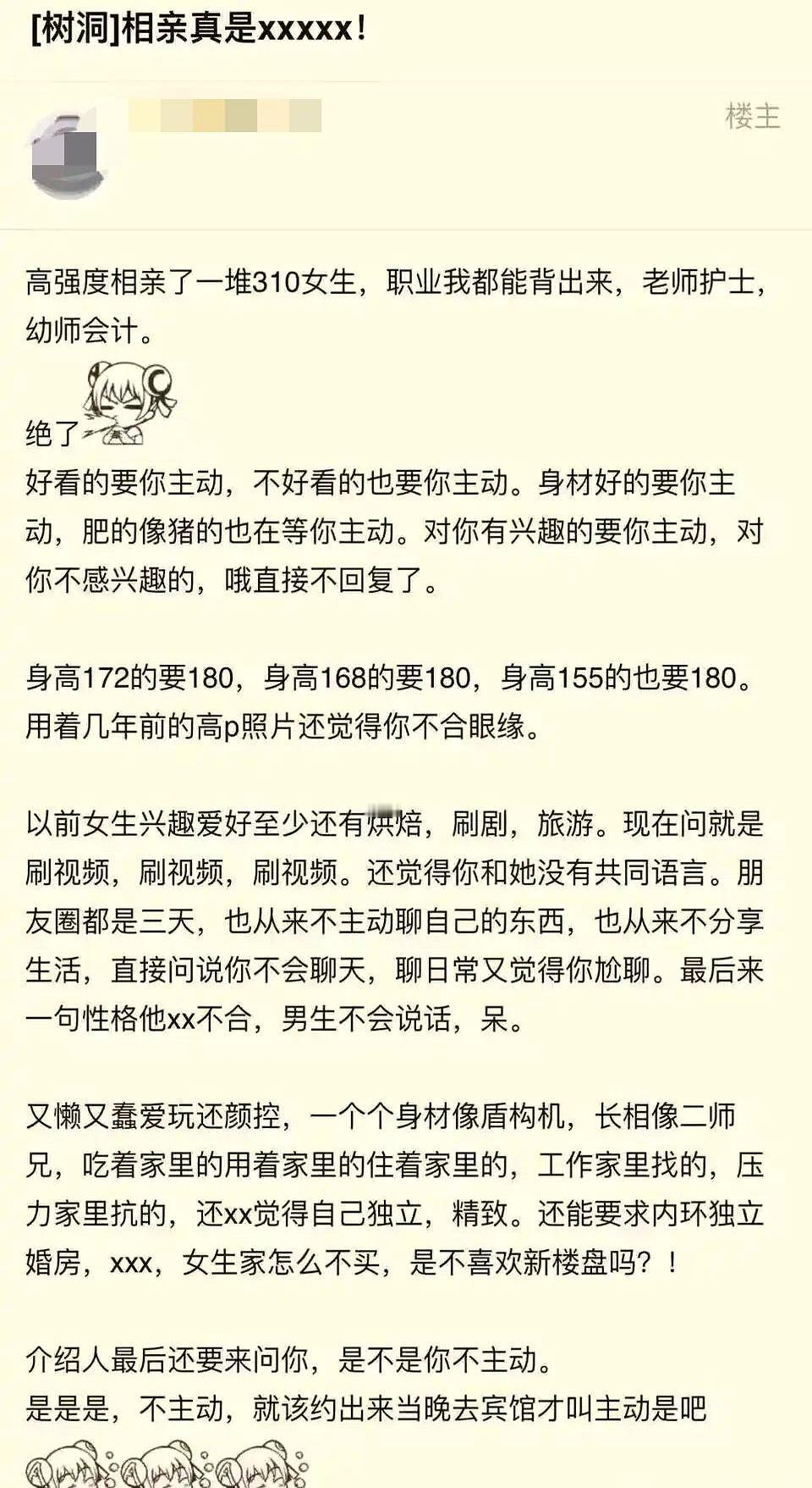 相亲刚坐下,女生开口就问“市区有房吗?月薪过万没?”男生说在攒首付,下一秒就被拉黑。 现在年轻人相亲,咋成了“考官”对“考生”? @奋斗的阿杰遇过这事:上次相亲,女生上来就问房问薪,他说在攒首付,对方一句“那先这样”,再发消息就是红色感叹号。 @小敏不是小敏觉得这很正常:自己168,穿高跟鞋不想仰头说话,所以要175+身高;要独立婚房,是不想婚后跟公婆挤,“提前说清楚,省得浪费时间”。 2024年婚恋平台数据显示,北京上海相亲市场男女比例1:1.5,女生选择空间更大。 62%女性把“经济稳定”放首位,58%男性觉得“持续主动”压力最大。 最新数据还显示,男性对“情绪价值”越来越看重,2024年关注“会沟通”的男生超四成,比三年前多了两成;女生除了经济,54%还看“家庭责任感”,比看外貌的多16个百分点。 现在相亲节奏快,首次见面平均45分钟就定“合不合适”,有人说像面试,有人觉得这是效率。 到底啥样算平等? 或许得双方都少点“考题”,多点“聊天”。