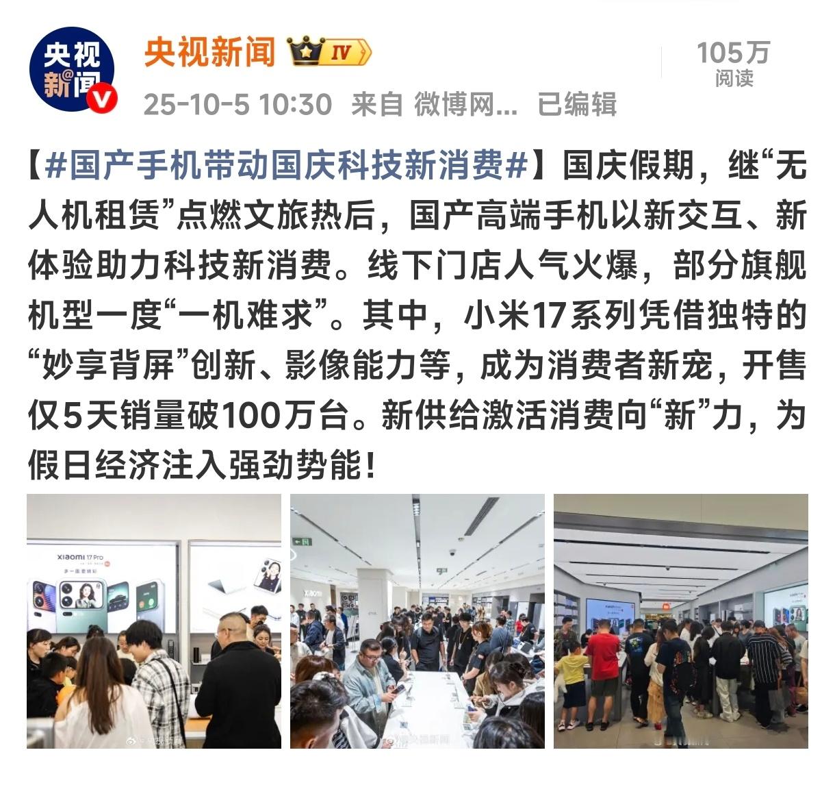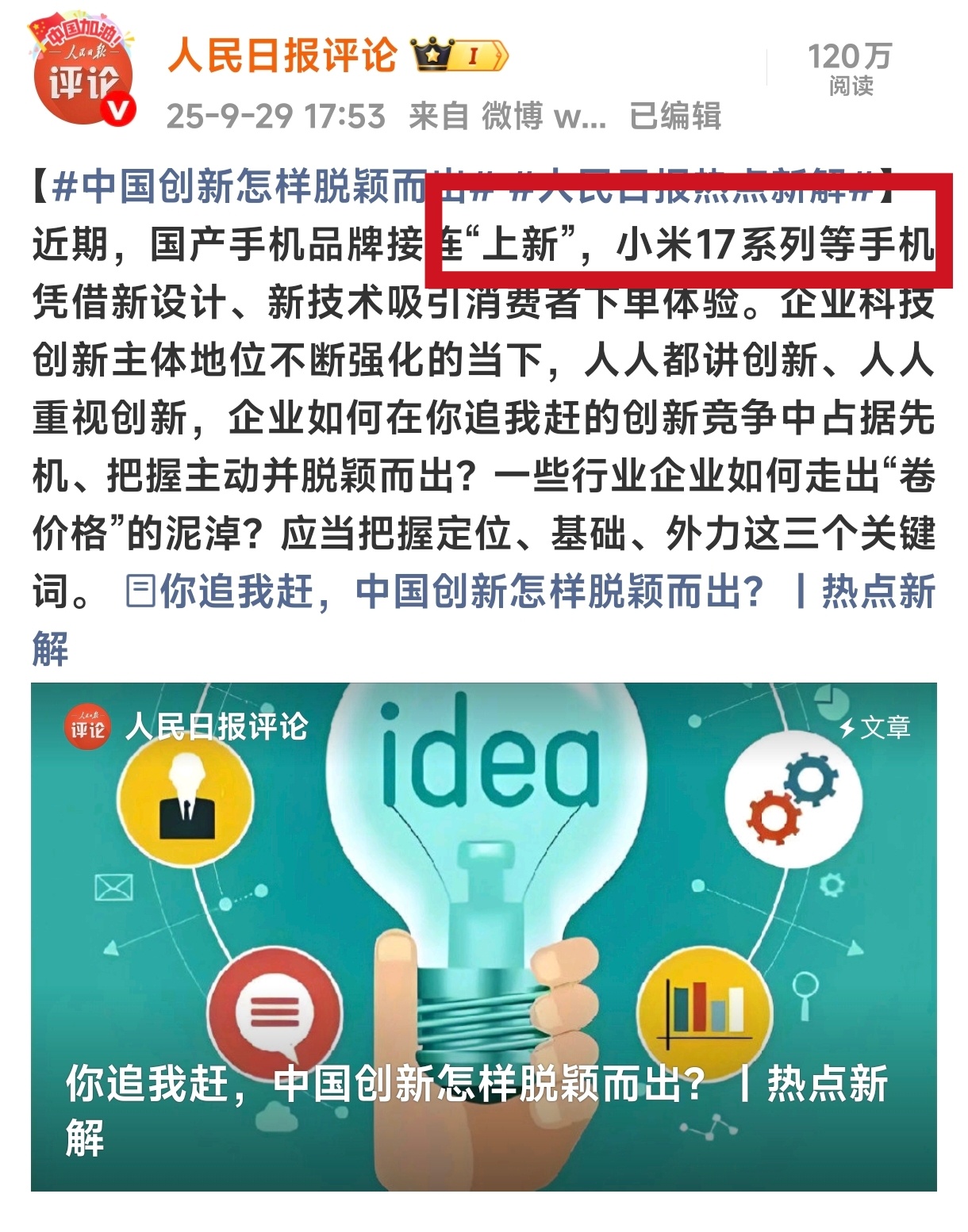 小米 17 系列的火爆,已经引发了新华社的关注 新华社评小米对标苹果 我很喜欢新华社的评价,对标国际一流的核心不是模仿产品形态,而是学习苹果对核心技术的坚守、用户体验的执着及技术创新的耐心。