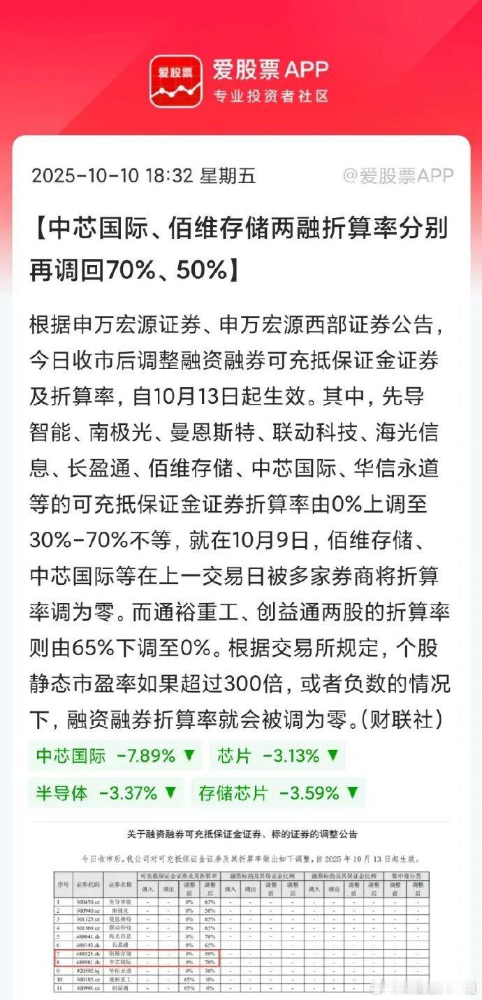 中芯国际两融折算率再调回70%,下周一10月13日生效!今天刚从70%调到0,下一个交易日又调整到70%,券商玩的是真溜啊。