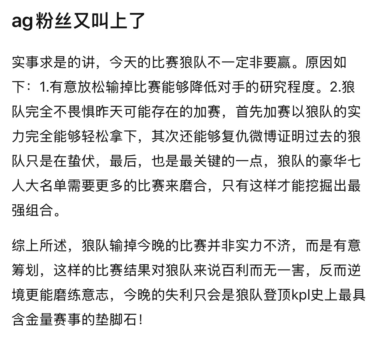 综上所述,狼队输掉今晚的比赛并非实力不济,而是有意筹划,这样的比赛结果对狼队来说百利而无一害,反而逆境更能磨练意志,今晚的失利只会是狼队登顶kpl史上最具含金量赛事的垫脚石!