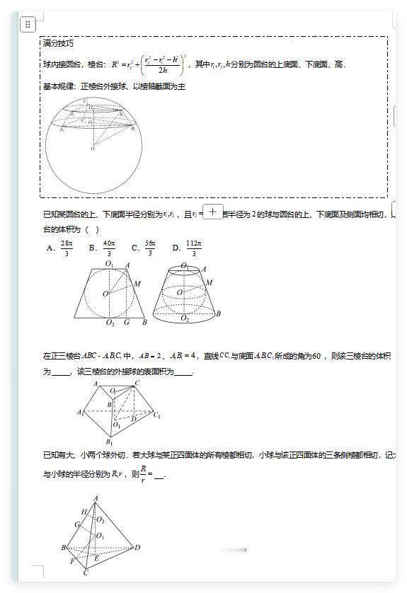 立体几何压轴·球类 新高考趋势高考数学 立体几何 三大类 内接 多球 棱切接问题 台体的切接