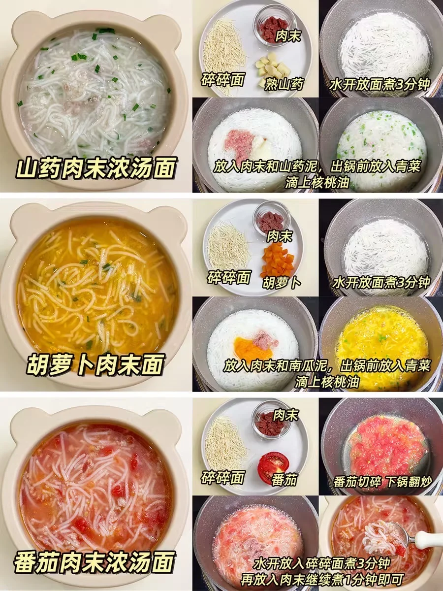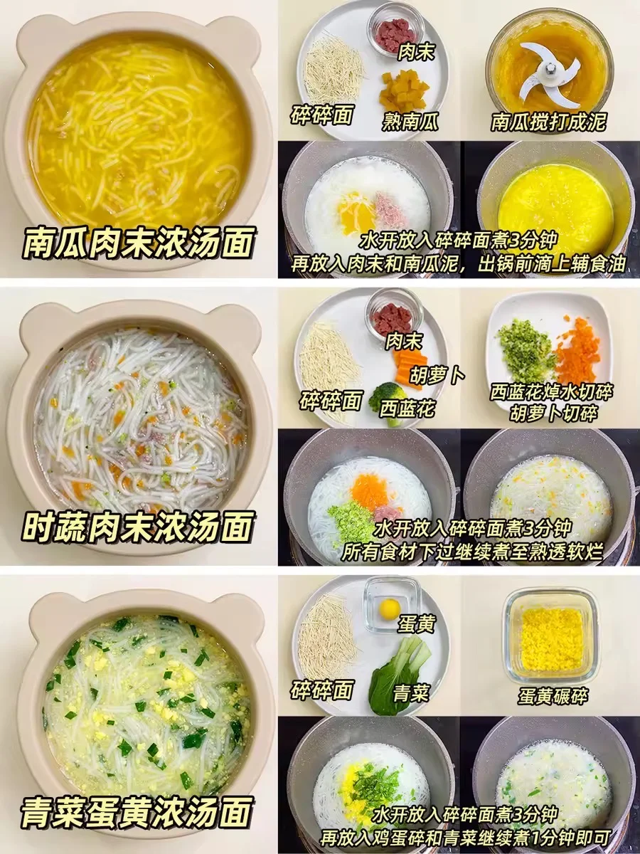 宝宝吃辅食1个月后,就可以逐渐添加一些基础辅食粥、辅食面,搭配不同的食材,增加食物多样性和营养密度‼同时食物保持微颗粒感,可以锻炼宝宝咀嚼能力~ 总结分享12款基础搭配的辅食粥、碎碎面食谱,营养好消化,简单不重样~新手爸妈收藏🌟 南瓜瘦肉粥 菠菜蛋黄粥 番茄牛肉粥 红薯苹果粥 胡萝卜鸡肉粥 西蓝花鲜虾粥 山药肉末浓汤面 胡萝卜肉末浓汤面 番茄肉末浓汤面 ...... 具体做法看上面图片