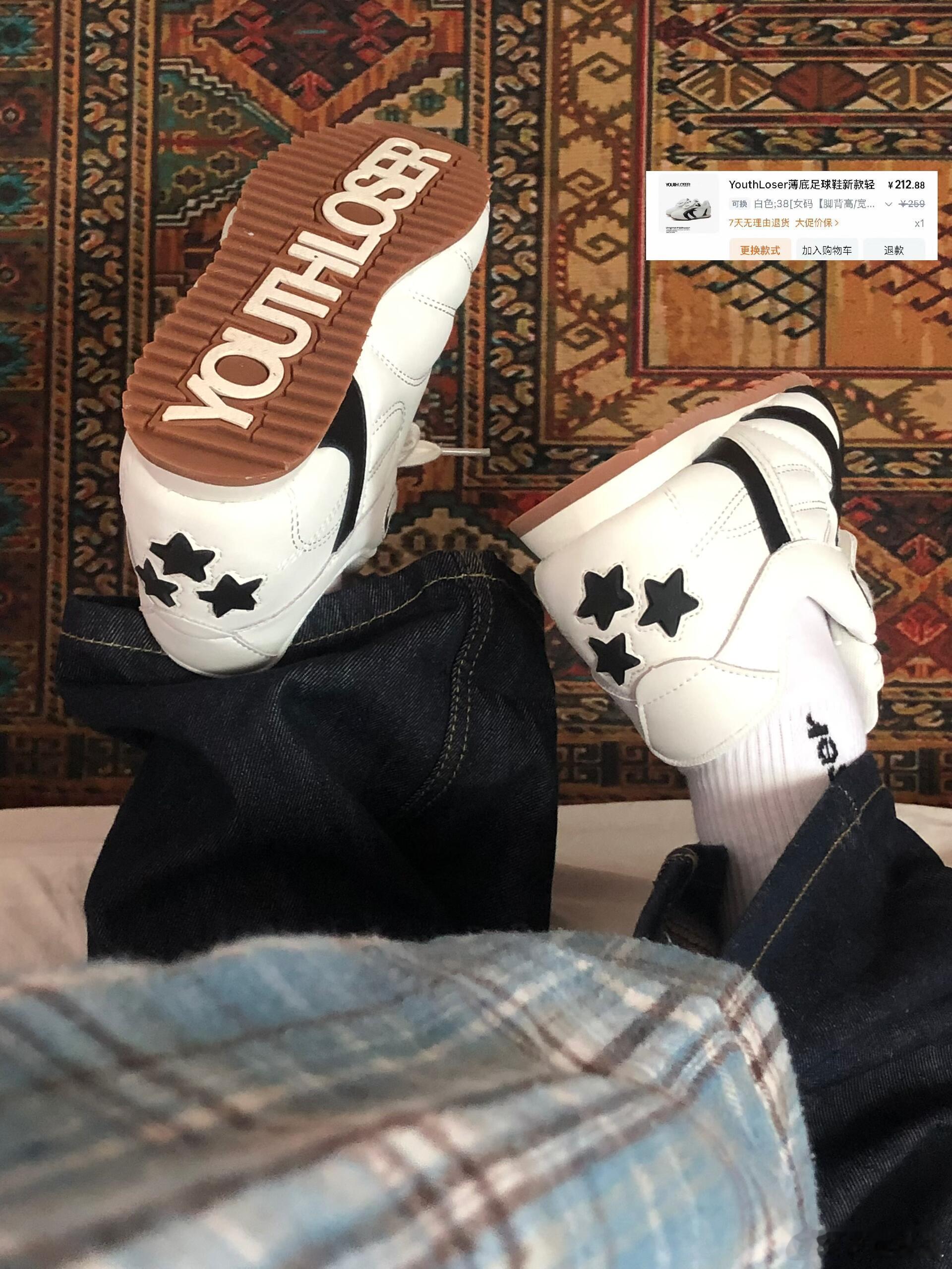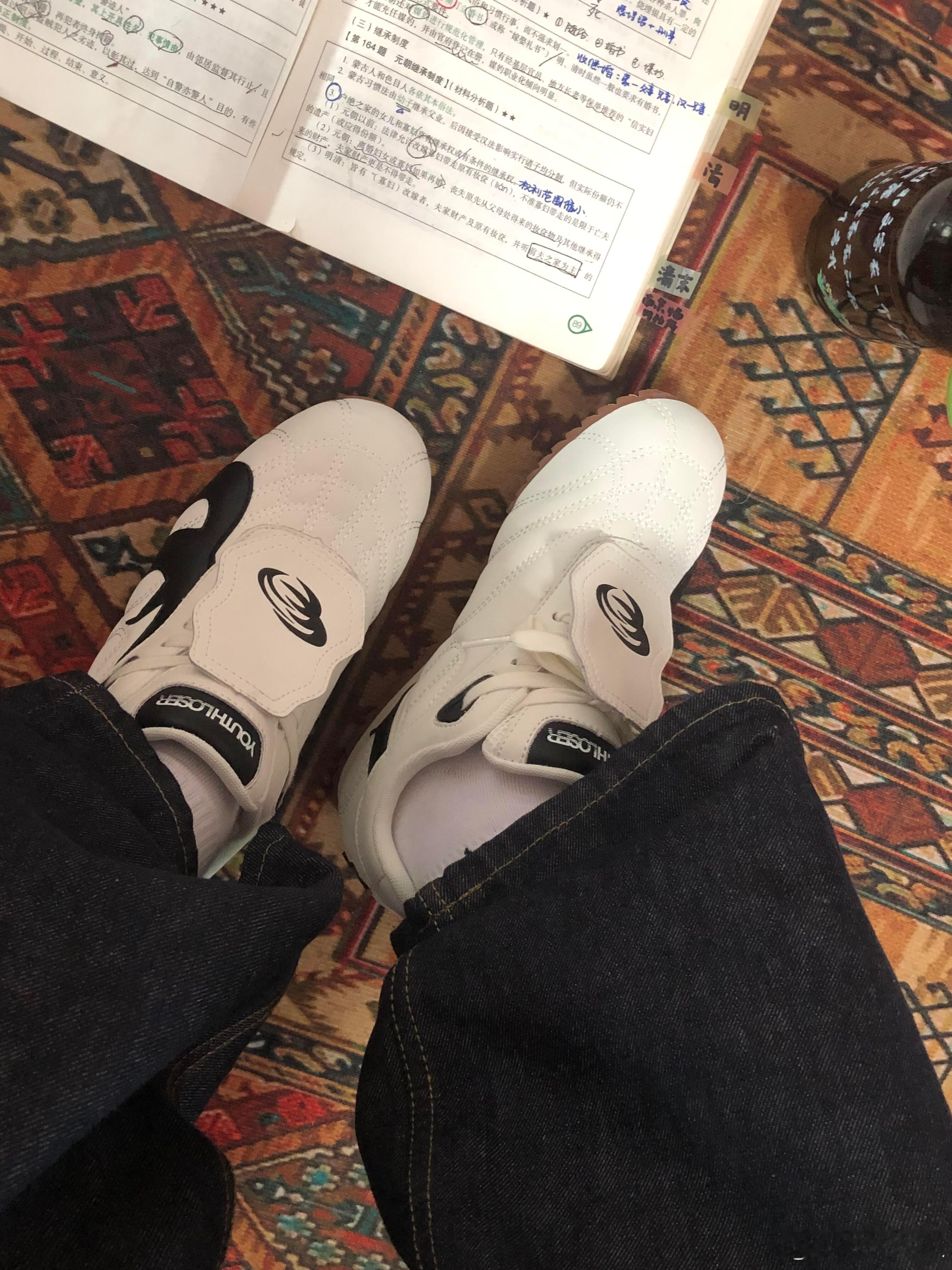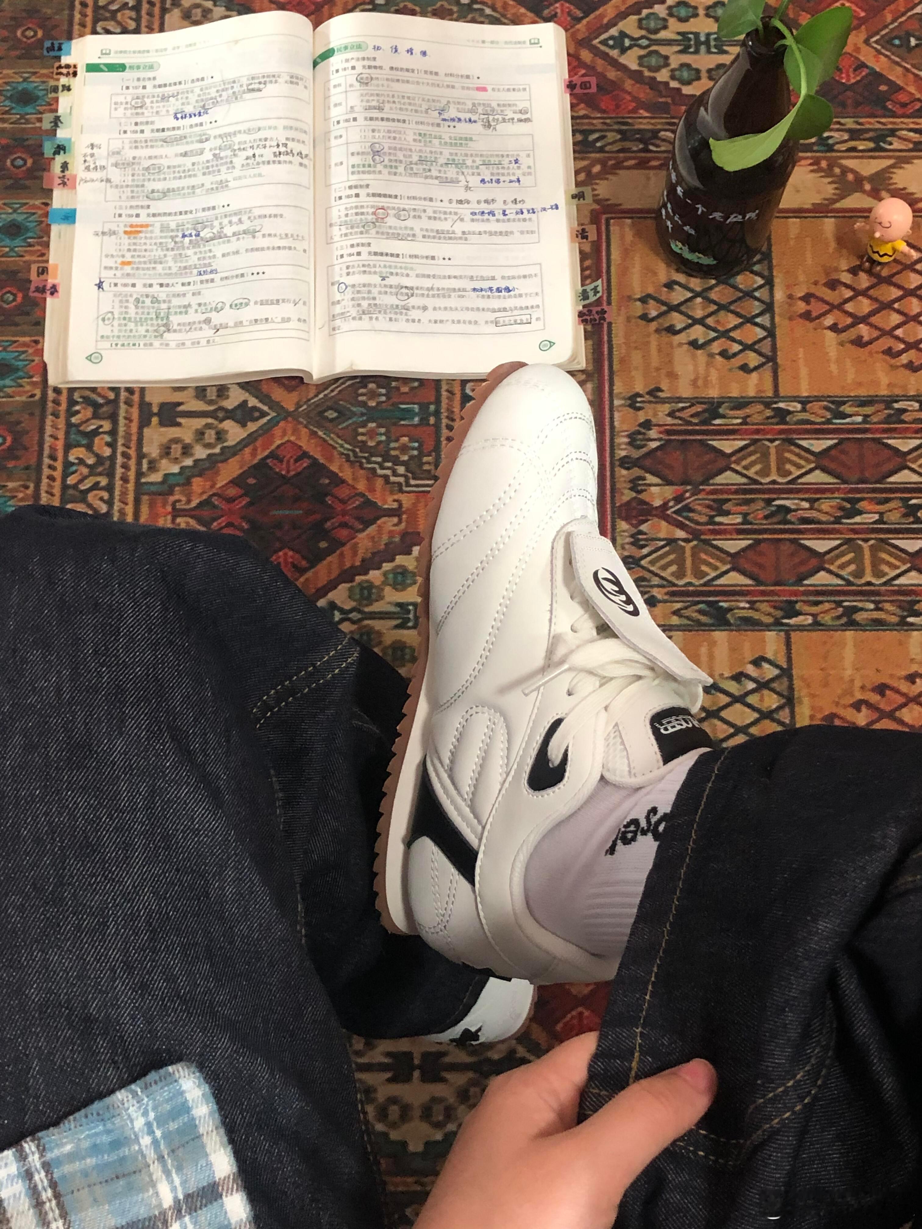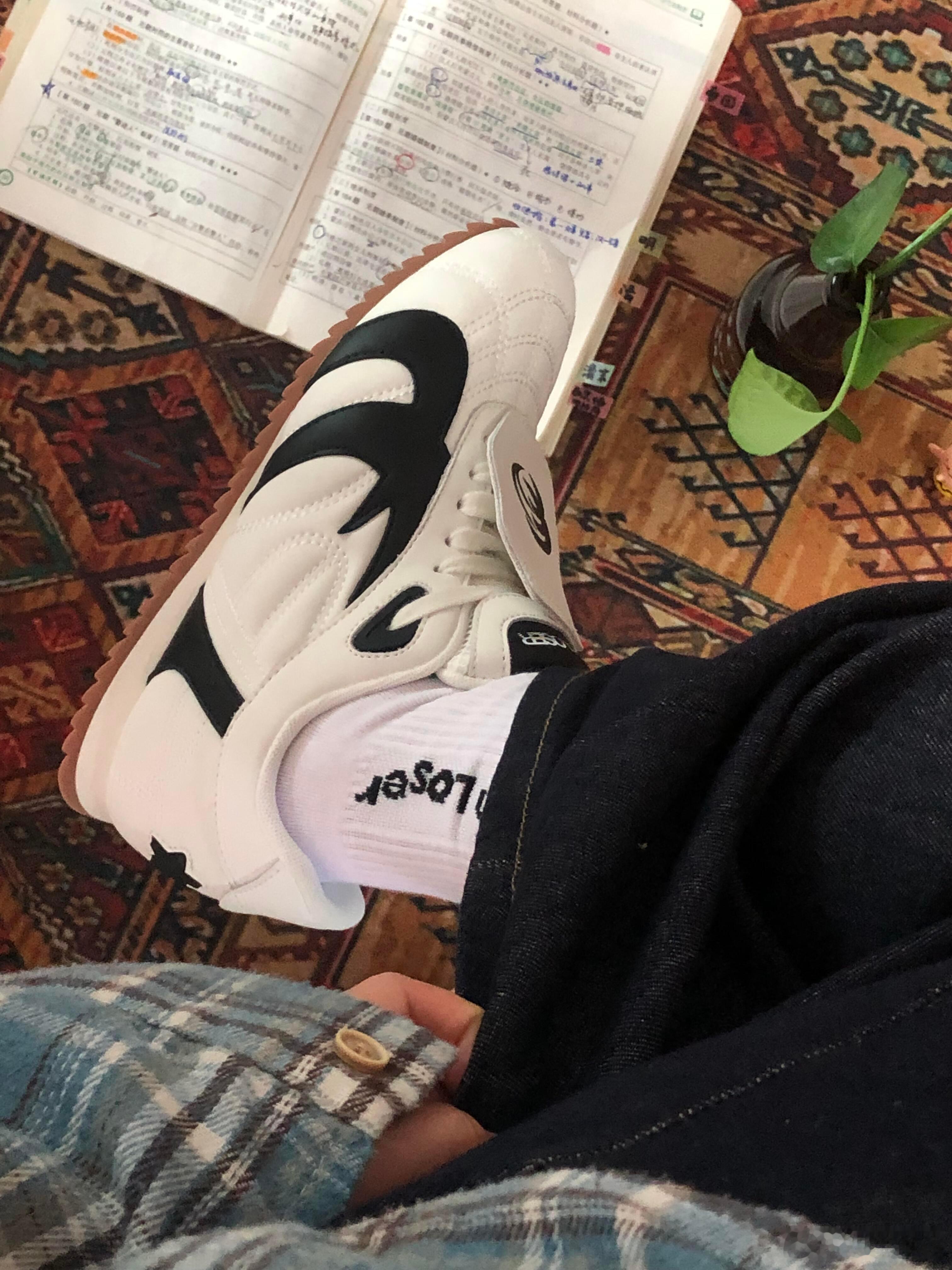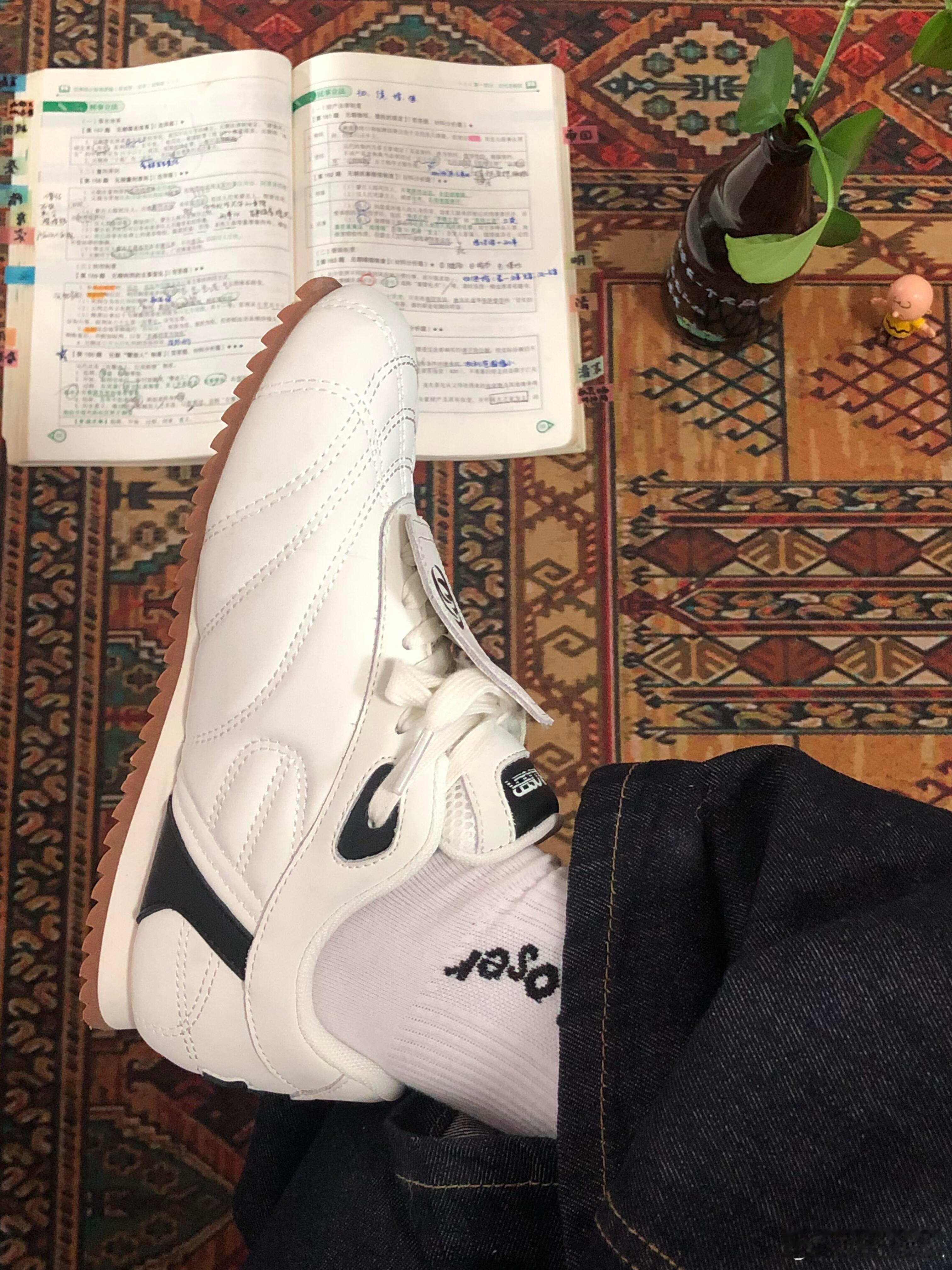 鞋子穿着在一只白色袜子上,袜筒上的“OSER”字母清晰可见。它被置于一张充满民族风情的红褐色地毯上,与摊开的书籍、绿植等物品共同构成了一幅文艺而生活化的静物画面。这款鞋完美融合了休闲时尚与户外元素,非常适合日常潮流穿搭。时尚鞋履SOTD鞋控的日常
