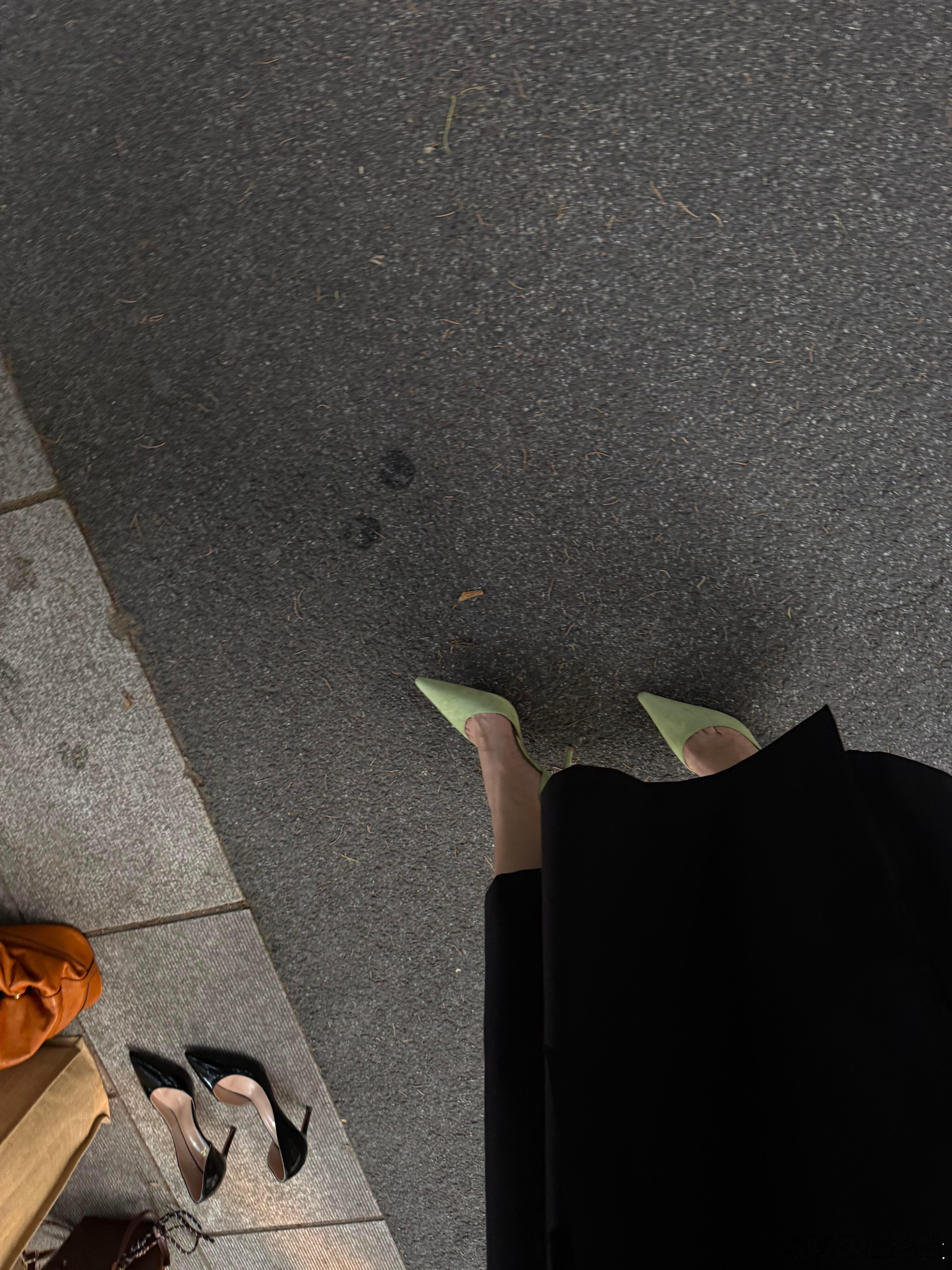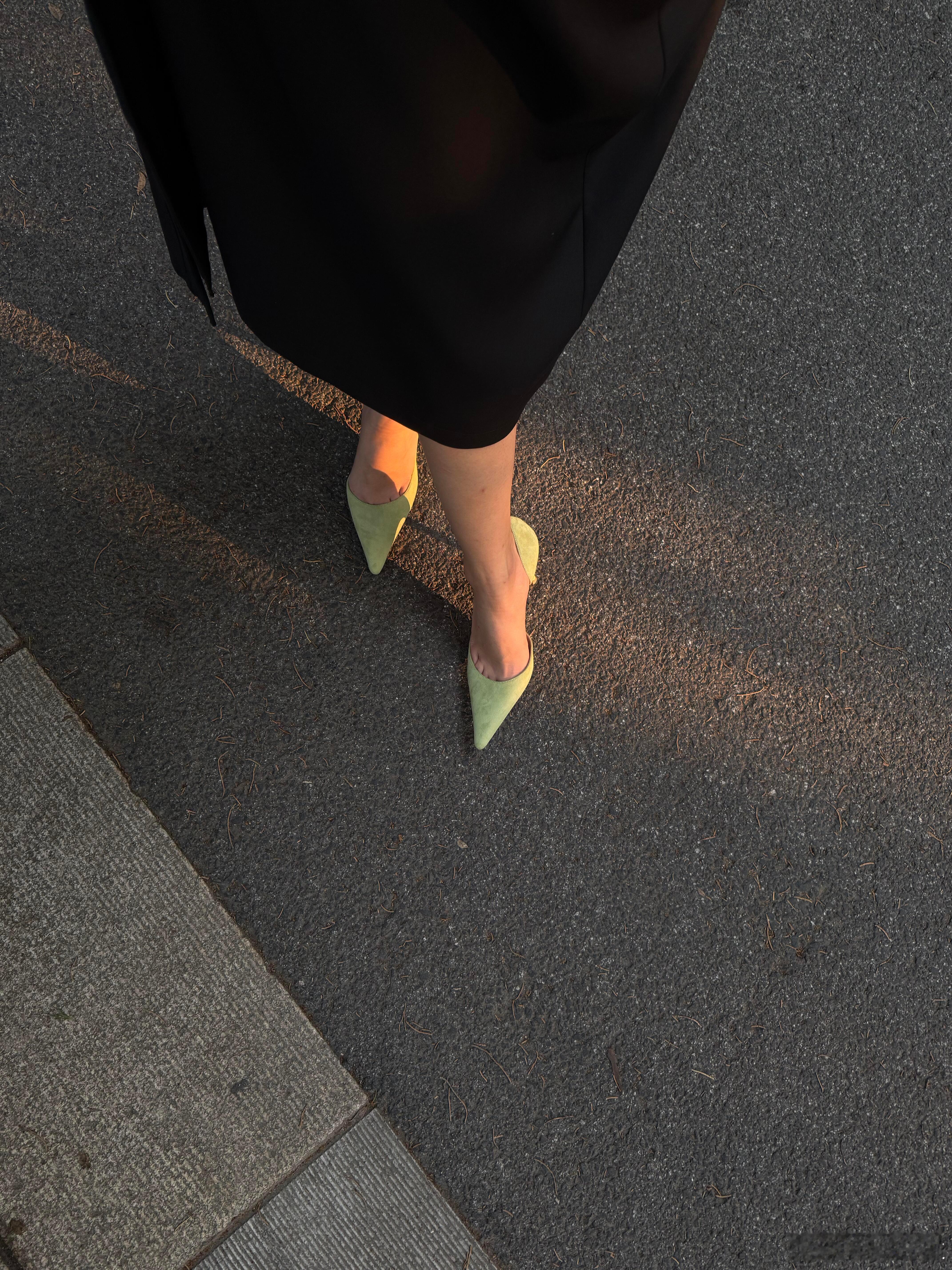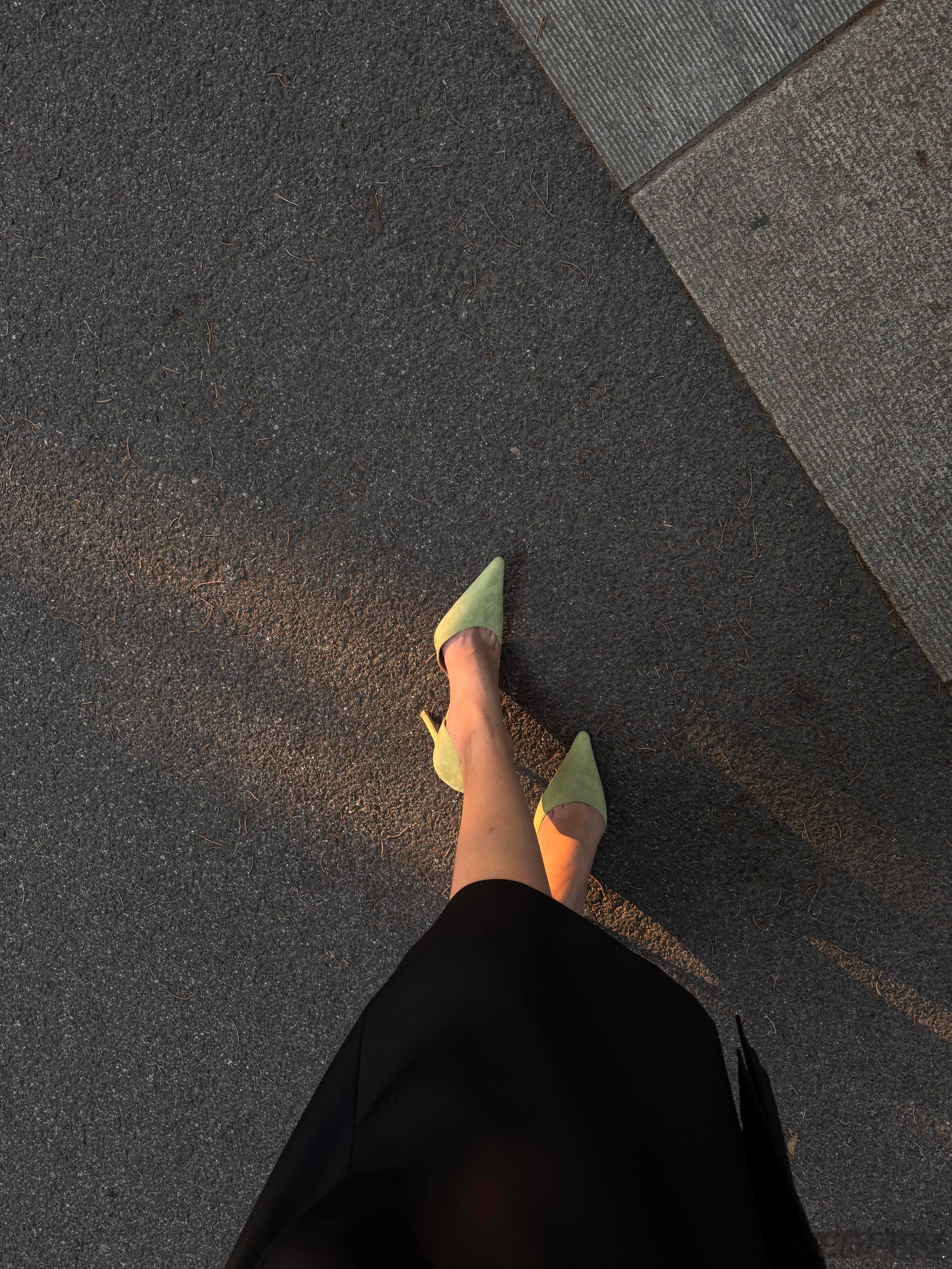 这双尖头高跟鞋以一抹清新柔和的浅绿色绒面革,瞬间成为视觉焦点。经典的细高跟设计优雅地拉长了腿部线条,而适中的高度则确保了日常穿着的舒适度。鞋子在傍晚时分柔和的阳光下呈现出细腻的质感变化,一道明亮的光带划过鞋面,与深灰色沥青路面上投下的修长阴影,共同构成了一幅极具氛围感的画面,整体风格简约而时尚,完美诠释了低调的优雅与随性的都市格调,非常适合从办公场合到休闲约会的多种场景。时尚鞋履SOTD鞋控的日常