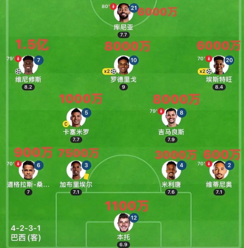 巴西超豪华锋线!!! 维尼修斯身价1.5亿; 罗德里戈身价8000万; 埃斯特旺身价6000万; 库尼亚身价6000万; 注:单位(欧元)! 巴西队三条线上都有超级球员压阵,前场四人攻击群总身价高达3.5亿,韩国全队身价才1.1亿,两队完全不在一个档次。 最终,罗德里戈、埃斯特旺双双梅开二度,维尼修斯锦上添花,五星巴西5-0横扫韩国,桑巴军团强得可怕!