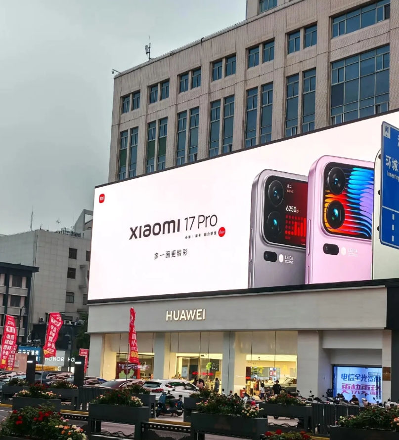 我在网上看到小米17的广告牌都放到华为店铺门头了,这波操作也太“挑衅”了吧!合着把对手家门口当自家广告位了?吃相难看不说,还显得格局小——要我说,至少放对面马路才叫“良性竞争”吧? 我感觉有点过分了,这哪是卖手机啊,简直是“宣战”仪式!线上对进行对标苹果,线下广告打到对方家门口,实在看不懂,这操作!