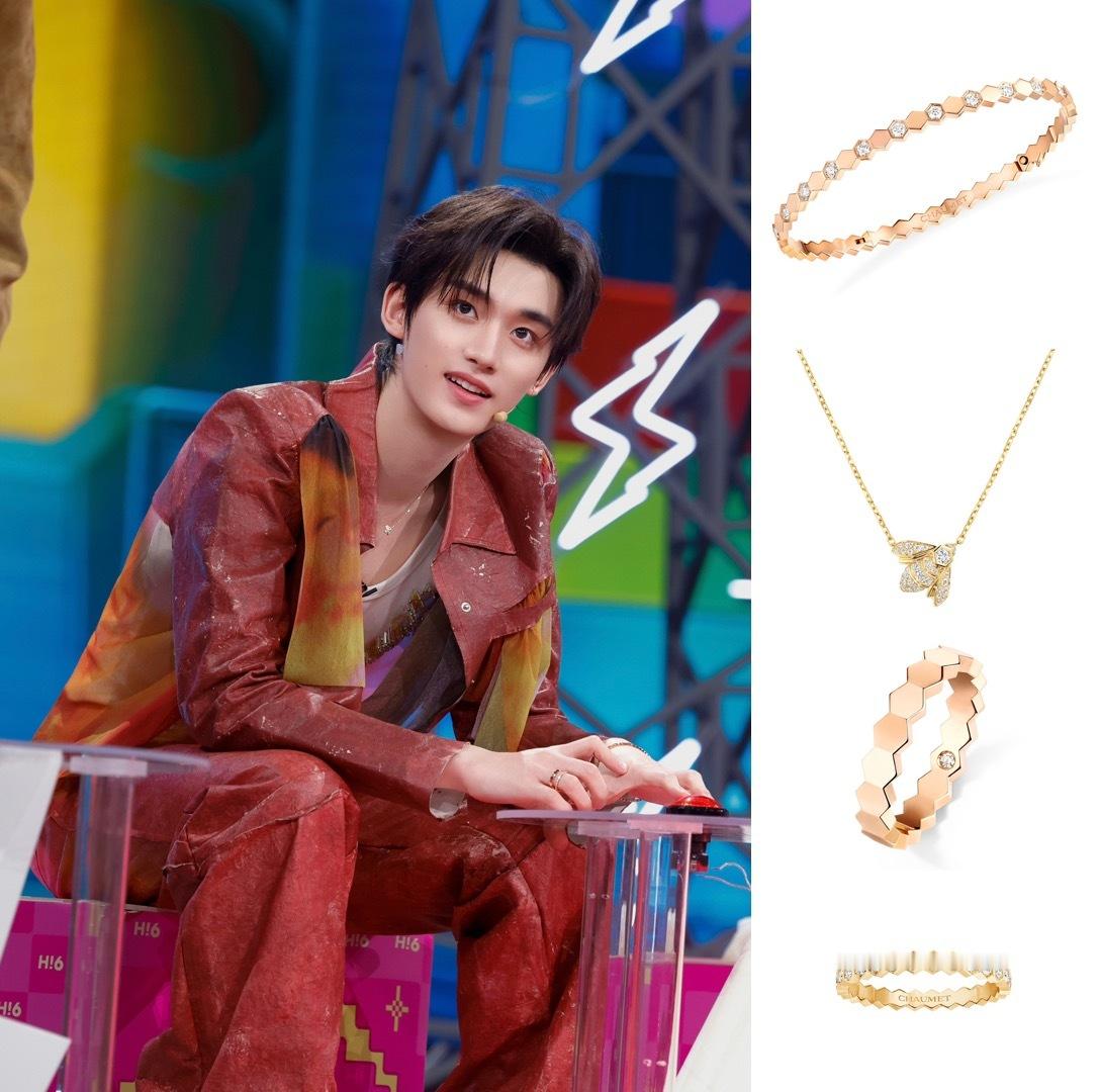 丁程鑫今日亮相《你好星期六》节目Look,身着J RUREMINDS皮革彩纱拼接套装内搭XUZHI钉珠装饰背心,全套珠宝来自尚美巴黎CHAUMET Bee de Chaumet系列,帅气抢眼,也相当有设计感的一套,小丁穿得很好看~