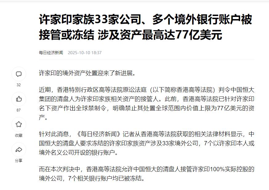 许家谋划半天,终究是一场空,私藏的160多亿保不住了。香港高院一纸判决,同意恒大清盘人的两大诉求,直接令许家印家族如五雷轰顶。 香港高院的这一纸判决,不仅把他藏了六年的,23亿美元家族信托,扒得底朝天,连带着12个国家的77亿美元资产全给冻了,伦敦33套豪宅、纽约整栋写字楼,这些曾经拿出来炫耀的“家底”,现在全成了被清盘人接管的资产。 早从2019年恒大刚开始爆雷那会儿,许家印夫妇就偷偷在美国搭了这个家族信托,对外说是什么给俩儿子留“永久饭票”,规矩定得挺细:长子只能拿利息动不了本金,本金得留给孙辈,听着多“长远”,实际上满肚子都是躲债的心思。 为了绕开监管,他们把资产裹了一层又一层,33家注册在英属维京群岛、开曼群岛的离岸公司,像叠罗汉似的把钱藏在最里面,连银行账户都用前妻丁玉梅和儿子的名字开,以为这样就能把资金锁得严严实实,谁也找不着。 可他们千算万算,没算到法院看的是“实际控制”,不是表面那层花架子。法官直接引用判例敲死了:就算资产放进信托,只要实际控制人能随便调遣、说了算,该冻结照样冻结。 再说这信托里的钱,哪来的?全是从恒大抽走的分红。2009年到2022年这十几年,他跟老婆从恒大拿走了500多亿人民币的红利,通过离岸公司一层套一层,悄咪咪转到海外。这边恒大的窟窿越捅越大,2023年中查出来总负债就高达2.39万亿元,供应商拿不到货款、业主收不到房子,那边他还在突击转移资产,这哪是做企业,分明是把恒大的家底掏空了往自己兜里塞,榨干了就想拍屁股走人。 而且恒大的债务危机,早就不是“没钱还”那么简单了,里面全是财务造假的烂账。2023年证监会查得明明白白,恒大在2019到2020年,靠提前确认收入虚增了5641亿元营收,财报上的数字全是编的,用“拆东墙补西墙”的法子把债务雪球越滚越大。到2025年6月,光是到期还不上的债务就有3592亿,商票逾期1910亿,600万业主等着收房,一堆供应商被拖得快倒闭,许家印倒好,自己先把钱挪到海外享清福,这良心是真能过得去? 这次许家印栽跟头,其实是给所有想靠“离岸架构”逃债的人,敲了个响警钟。别以为躲到海外就成了“法外之地”,现在法律的网早织到全球了。他犯了两个致命错: 一是资产混同,把恒大的分红当成个人财产随便转,完全无视公司是独立法人,该分的界限一点不拎清;二是恶意转移资产,明知道公司已经资不抵债、要扛不住了,2019年还突击设信托,这在法律上叫“欺诈性转让”,一抓一个准。之前张兰的家族信托被击穿,贾跃亭在美国申请个人破产重组,现在轮到许家印,这说明想靠海外壳子躲债,早就行不通了。 说起来许家印也是自己把自己玩死的。早年靠房地产发家,本来手里握着好牌,结果野心越来越大,一会儿造车、一会儿搞文旅、一会儿又碰金融,多元化没做成,反而把资金链拉得比面条还细。 更关键的是,他把企业信誉当废纸,把老百姓的血汗钱当筹码,600万业主掏了首付等着交房,供应商垫了钱等着结账,他却一门心思琢磨怎么把钱转移到海外,这种“自己吃饱不管别人死活”的操作,早晚得栽大跟头。 现在再看,曾经的“中国首富”落到这步田地,真没啥好同情的。出来混总得还,法律不会放过任何一个钻空子的人,市场也更不会容忍这种没底线的操作。恒大的烂摊子还得慢慢收拾,600万业主的房子能不能顺利交付,2.39万亿债务怎么化解,这些都是实打实的难题,但至少这次香港高院的判决让大家看到:不管你藏得多深、手段多花,只要做了违法违规的事,总有被揪出来的一天。 你们说,许家印这算不算自作自受?要是他早把心思放在好好经营企业、解决业主和供应商的问题上,而不是一门心思想着转移资产,会不会是另一个结局? 参考资料:每日经济新闻
