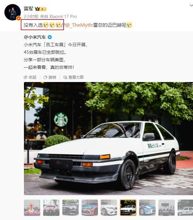 小米汽车「员工车展」今日开展,包括卡丁车、FI Alfa Romeo、丰田AE86、高尔夫等。 有网友留言:雷总的迈巴赫呢[抠鼻] 雷军回复:没有入选[捂脸] 咱们就是那是小米员工车展,不是老板车展。单雷总买过的车,都能办一场车展了[做鬼脸]