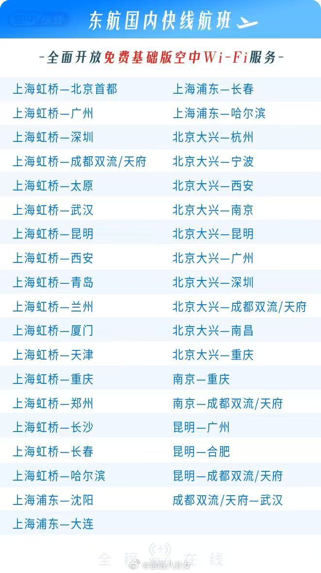 东航国内快线开放免费空中WiFi从10月11日起,该航司所有宽体机执行的国内“空中快线”航班提供经济舱全舱位免费Wi-Fi服务[吃瓜]