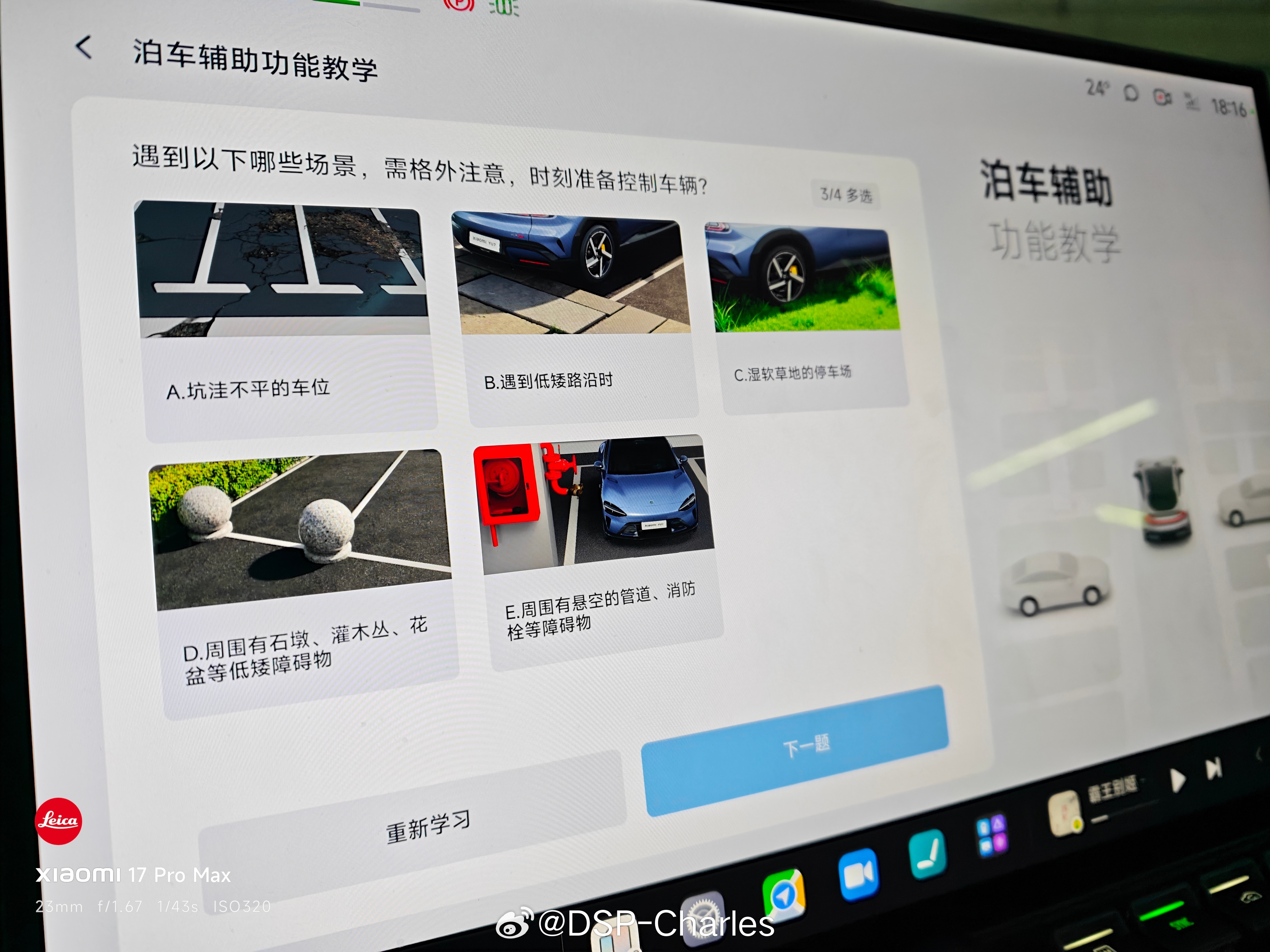高度差的路面,需要用户观察,谨慎使用泊车辅助功能,这是辅助驾驶学堂必修课,没经过教学是用不了这个功能的