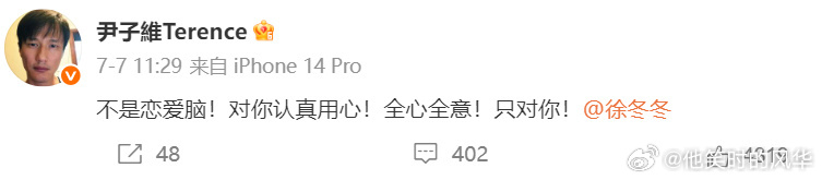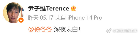 尹子维凌晨5点还在表白徐冬冬 救命!尹子维完全是恋爱脑实锤!凌晨5点发文表白,戏外黏人式深情,和徐冬冬台上酷飒台下甜蜜,反差萌戳中我了!
