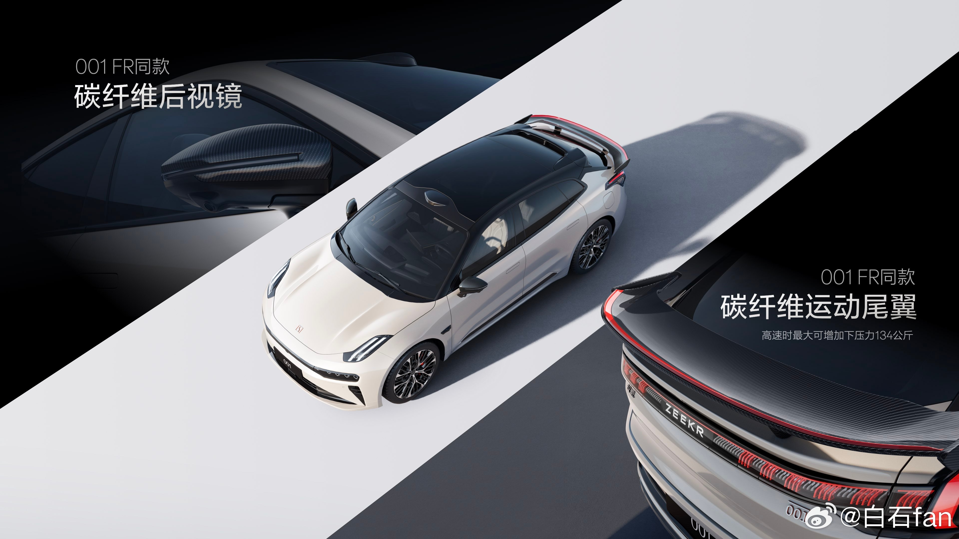 焕新001这次除了依然优秀的大空间外,还带来了001 FR的碳纤维运动尾翼和碳纤维后视镜。