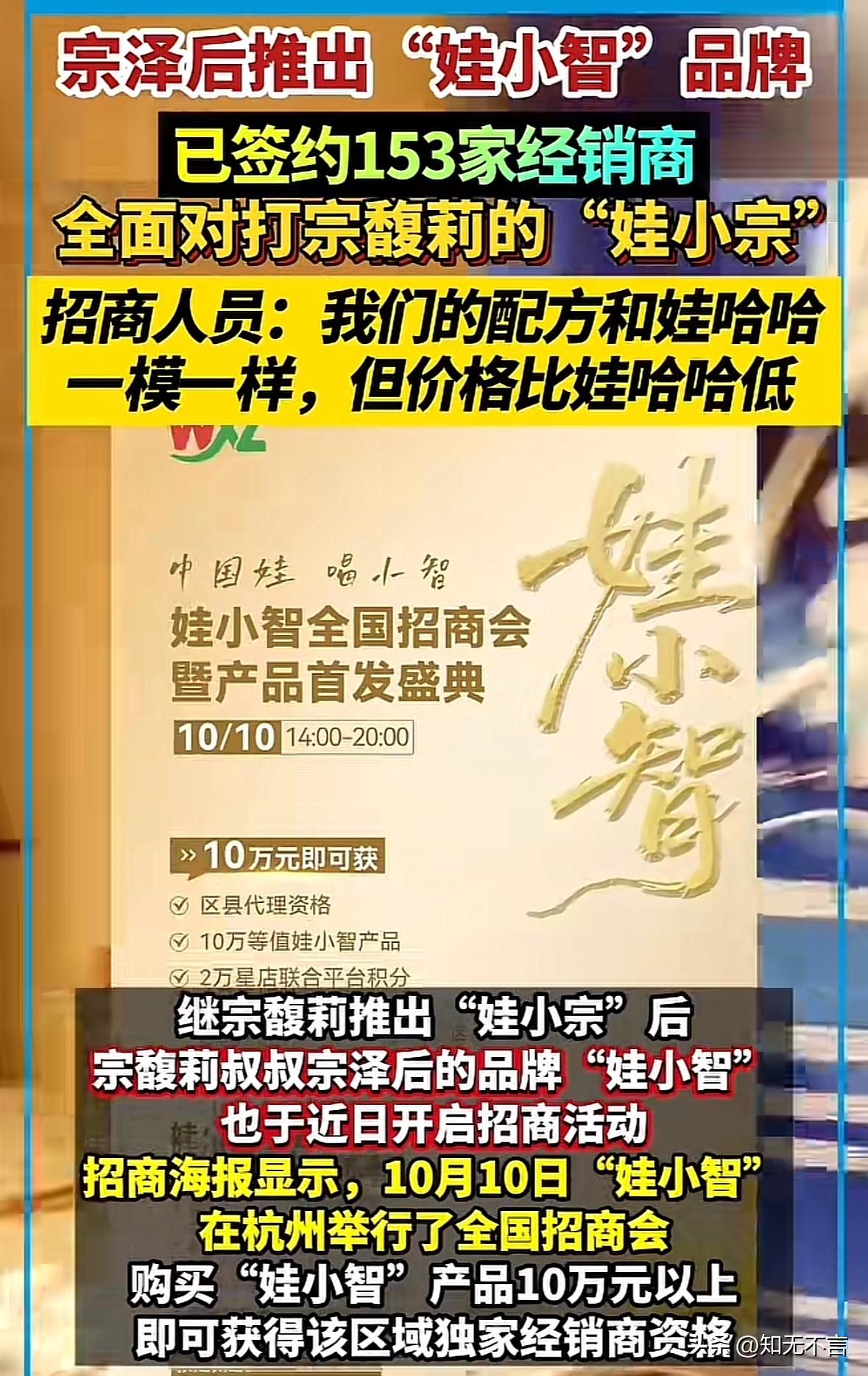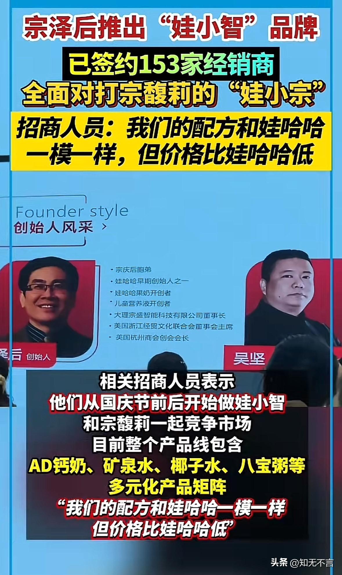 宗馥莉的叔叔宗泽后要来抢她的市场了,宗馥莉出走娃哈哈创立“娃小宗”,他就创立了“娃小智”,而且已经签了153家经销商,还说配方与娃哈哈一样,但价格比娃哈哈低 曾经的饮料界大佬,如今分崩离析,自创品牌与娃哈哈竞争,未来娃哈哈的前景堪忧,俗话说“知己知彼百战不殆”,娃哈哈的打法恐怕要改变了 但是宗泽后在侄女创立自己的品牌后也搞了一个,这个做法有点不厚道啊,虽然商场如战场,战场无父子,但自己的哥哥走了也才一年,就这样对侄女不太好吧 豪门的生活很多人都羡慕,但里面的明枪暗箭却不是每个人都能躲得掉的,大家说对吗?