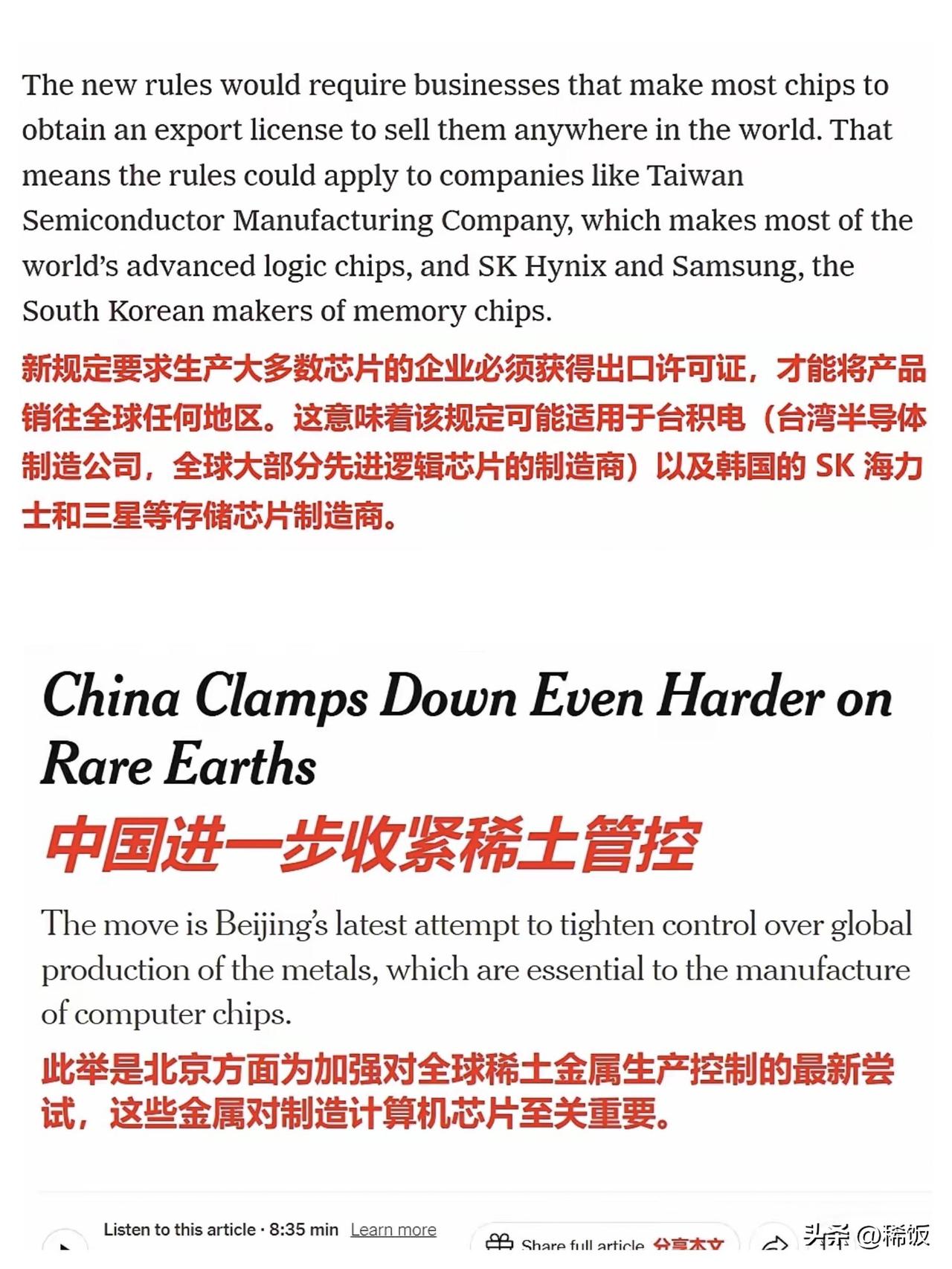 快讯!快讯! 《纽约时报》的意思是:根据中国的新一轮打击措施,总部位于台湾的台积电无法向美国出售任何半导体芯片,因为这些芯片含有……来自中国大陆的稀土矿物。 这说法看着唬人,其实藏着春秋笔法。哪是什么“打击”?分明是对美国“长臂管辖”的对等回应,早该如此! 美国先前怎么干的?拿技术卡我们脖子,含美国技术的芯片都不许卖给中国。现在不过是换我们掌握主动权,这叫以彼之道还施彼身。 关键不在“禁售”,在管制的力度。新规里写得明白,只要含0.1%中国稀土,出口就得申请许可。这个比例低到几乎覆盖所有高端芯片。 台积电想绕开?难如登天。芯片制造的光刻机、蚀刻机里,稀土永磁材料是核心部件。全球90%的稀土精炼产能都在中国,根本没得换。 美媒只提台积电,故意缩小了影响范围。三星、SK海力士早就慌了,韩国政府正急着找中国磋商,这才是真实写照。 管制精准打在七寸上。14纳米以下逻辑芯片、256层以上存储芯片,这些高端领域的申请要逐案审批。这不是乱打,是精准狙击。 有人说这是“卡脖子”,没错,但卡的是不合理的技术霸权。美国能卡我们芯片设备,我们就不能管战略资源?这逻辑太双标。 中国的底气来自硬实力。北方稀土一家市值就接近1900亿,全产业链实力摆在这。不是谁都能随便替代中国稀土的地位。 那些喊着“去中国化”的国家,现在该醒了。美国投资的稀土矿刚起步,想量产至少要五年,远水救不了近火。 这招根本不是要搞死谁,明眼人都懂是“以打促谈”。逼那些国家坐下来好好谈,别再搞技术封锁,这才是真正目的。 把台湾称作“国家”,《纽约时报》的用心太险恶。台积电是中国台湾的企业,这是铁打的事实,任何时候都不能含糊。 别被西方媒体带了节奏。我们管制的是稀土,守护的是国家安全和产业尊严。这步棋,走得稳、走得硬气! 各位读者你们怎么看?欢迎在评论区讨论。