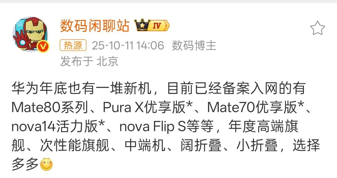 华为年底也有一堆新机看看闲聊站的爆料,除了重磅旗舰华为Mαte80系列之外还有一堆新机要来,阔折叠小折叠中端机等等,喜欢华为的朋友可以期待一下
