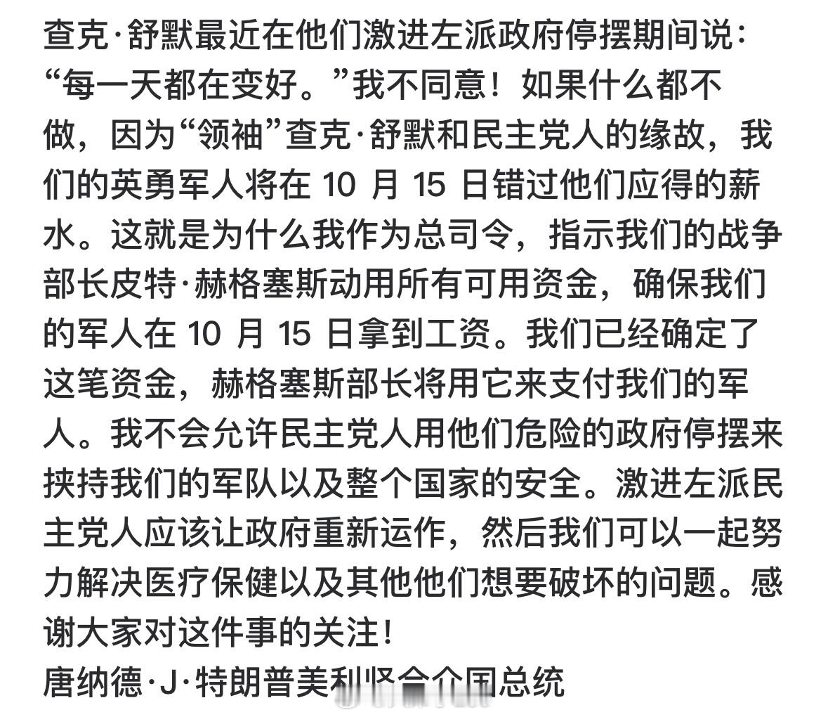 特朗普表示,必须要给军人发工资