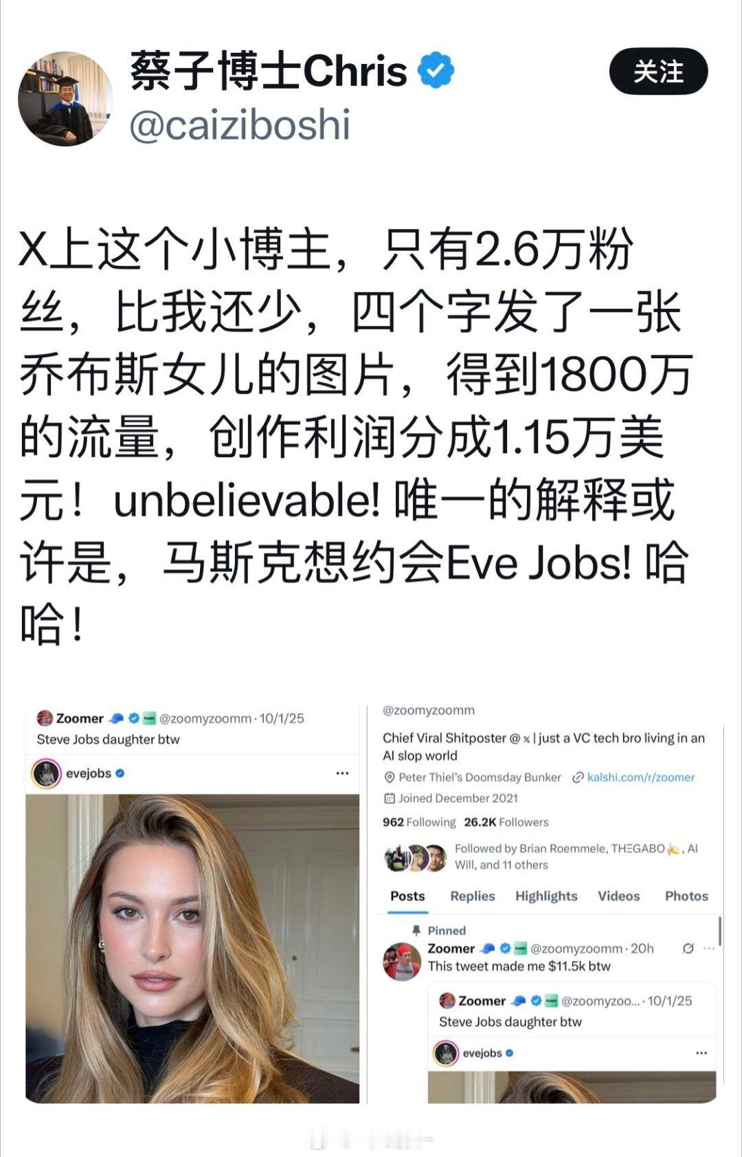 另外乔布斯女儿已经结婚了,必须帮马斯克辟个谣。马斯克现在应该一心一意谋发展,聚精会神搞建设,重点在AI,不是爱。