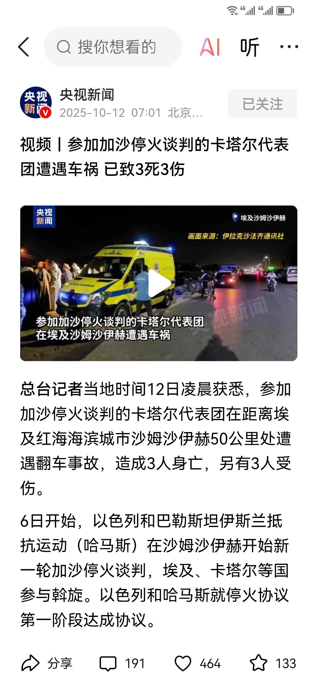 卡塔尔加沙谈判代表队团灭! 卡塔尔一行6人前往埃及途中遭遇车祸,3死3伤。 他们