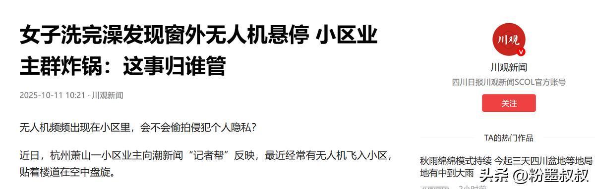 “防不胜防!”9月30日,浙江杭州,一女子下午在家里洗澡时,刚走出浴室,突然就看见窗户外面悬空着一架无人机!这台无人机正对着自家阳台,女子怀疑被偷拍立刻报了警,网友:应该好好管管这些无人机飞手了。 9 月 30 号下午三点多,浙江杭州的天气不算热,一位姑娘在家刚洗完澡,头发还滴着水,身上就裹了个浴巾,正想着去卧室找套干净衣服穿,路过客厅窗户的时候,眼角余光突然瞥见外头有个东西在晃,仔细一瞅心瞬间提到了嗓子眼儿,那居然是一架无人机,就悬在自家七楼的窗户外头,镜头看着像是正对着阳台,离得近得能看清机身的纹路! 姑娘当时就慌了手都有点抖,刚洗完澡身上就裹了个浴巾,家里这地方,本以为是最安全、最私密的地儿,结果突然冒出来个 “空中眼睛”,谁知道有没有在拍? 她赶紧往后退了两步,躲到窗帘后头,隔着缝隙再看,那无人机还在慢悠悠悬着,“嗡嗡” 的声音虽然不大,但在安静的屋里听得格外清楚,像个小虫子似的让人浑身不自在。 她第一反应就是 “被偷拍了”,赶紧喊来男友王先生,王先生跑过来一看,也觉得不对劲,七楼啊,按说这么高的楼层,平时连楼下的人都看不清家里,怎么会有无人机直接凑到窗跟前? 他没敢惊动外头的无人机,先让姑娘赶紧去卧室穿好衣服,自己则拿出手机,对着窗外的无人机拍了几段视频,留作证据接着就打了 110 报警,还联系了小区物业,让他们帮忙留意无人机的动向。 物业和民警来得还挺快,当晚八点多就顺着无人机的飞行轨迹和信号,找到了飞手,谁能想到居然是住在隔壁单元的邻居!这一下更让人心里发毛了,都是抬头不见低头见的人,怎么会干这种事?民警当即查看了无人机里的拍摄记录,结果显示 “没发现不当画面”,从法律上来说没法直接定性成偷拍。 可这话听在姑娘耳朵里,一点没觉得安心, 那种被窥探的恐慌、私密被打破的不舒服,是实实在在的,就算没拍到啥,那几分钟的惊吓也抹不掉啊。 飞手倒是解释说自己是新手,刚买了无人机,想在小区附近练练手,没注意飞到别人家窗户跟前了,不是故意要窥探,可这话谁能完全信呢?小区里玩无人机的人不少,但大多都是去小区广场、或者周边空旷的地方飞,很少有人会往居民楼窗户跟前凑,毕竟大家都知道,阳台、窗户跟前都是人家的私人空间,就算是无意的,也容易让人误会。 有常年玩无人机的业主就说,他们飞的时候都会特意避开居民区低空,一来怕撞着楼,二来就是怕打扰别人隐私,这点常识还是有的,这事儿在小区业主群里一说,不少人都跟着吐槽 “太吓人了,真是防不胜防”。 有业主说,自己平时在阳台晒衣服、或者陪孩子在客厅玩,都没在意过楼上楼下,更别说天上的无人机了,现在一想到可能有镜头对着家里,连开窗户都得犹豫半天,还有人说之前就见过小区里有无人机飞得特别低,掠过阳台顶当时没多想,现在看来真是得留意了,你根本不知道哪架无人机是正常练习,哪架是别有用心,也不知道它啥时候会突然出现在你家窗外,这种没法预判的感觉,才最让人不安。 有人说 “那平时拉上窗帘不就好了?” 这话听着像回事,其实根本不对,家是自己的地盘,凭啥要靠拉窗帘来 “躲着” 别人的窥探?难道不是应该让那些随意乱飞的无人机守规矩吗?我们住在家里,放松地洗澡、换衣服、跟家人聊天,这些都是最基本的私密,凭什么要因为一架突然冒出来的无人机,就得时刻提心吊胆? 网友们看到这事儿,也都炸了锅,纷纷说 “应该好好管管这些无人机飞手了”,不是不让玩是得有规矩,居民区尤其是高楼窗户附近,就该划成禁飞区,飞手也得有自觉别把自己的爱好建立在别人的不安上。 不然的话咱们在家连点安全感都没有,毕竟无人机这东西小巧灵活,能飞到你想不到的高度,躲都没法躲,真是防不胜防。 说到底,这事儿最让人闹心的,就是那种 “失控感”,你以为住得高就安全,以为在家就私密,结果一架小小的无人机,就能轻易打破这些防线。 希望能有更明确的规定管着,别再让 “空中眼睛” 随便闯进别人的生活,让咱们在家的时候,能真真正正松口气,不用总担心窗外有没有 “不速之客”。 (信息来源:川观新闻——女子洗完澡发现窗外无人机悬停 小区业主群炸锅:这事归谁管)