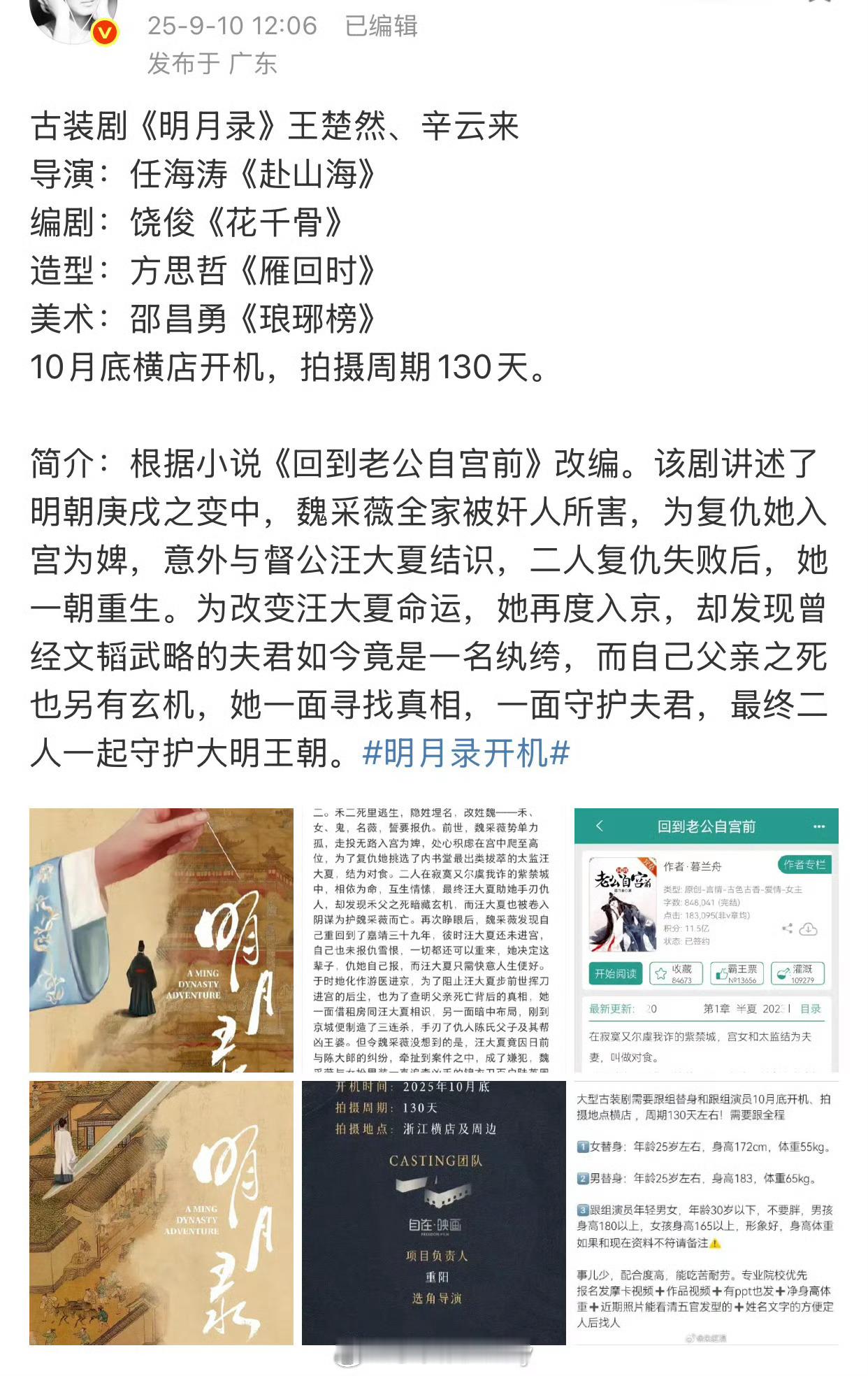 王楚然辛云来《明月录》即将开机