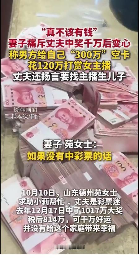 男人有钱就变坏!这句话变成现实了!山东德州苑女士和老公虽然不富裕,但是,日子过得还挺踏实的,两个人为了让这个家庭过得更好一起努力。男人在外面打拼,而苑女士则在家里照顾孩子。 然而,一场意外之财却改变了家里的平静。 据苑女士讲述,去年12月17日丈夫买彩票中了1017万元的大奖,税后814万元,按理说,这是一笔大奖,能够改变家庭的经济压力。 但是,自从丈夫中奖后,整个人彻底飘了,不仅不上班了,还到处挥霍自己的钱财。不仅将120万元打赏给女主播,还邀约一起出去游玩。最可气的是,丈夫竟扬言要找主播给自己生儿子。 而丈夫之前承诺给自己的“300万元”银行卡,用于二人的养老,也只是一张空卡,实际上一分钱也没有。 苑女士哭诉着说:“真不该有钱,如果没有中彩票的话,我是想跟他过一辈子的。然而,现在已经到了不得不离婚的地步。” 目前,苑女士已经向法院起诉离婚,女主播表示愿意配合,而苑女士的丈夫拒不露面,只解释自己没有钱。 而律师针对此事作出解释,中奖是夫妻共同财产,如果打赏数额严重损害夫妻共同财产利益,离婚时其中一方可主张对方挥霍共同财产。 网友看到后评论说,这就是守不住财的男人,千万财产就把它烧的不行了,他得瑟不了多久,就会又回到穷光蛋! 还有的网友说,上天给了他福运,可是他不懂,他有了财以后,他自己亲手去毁掉这个福。真的令人痛心呀! 有老婆孩子热炕头,你不懂得珍惜,有两个臭钱,你就开始认为自己了不起了!眼前的糟糠之妻配不上自己了,自己应该配得上更好的人,岂不知你口中所谓的更好的人,就是贪图你的钱财罢了!等你把这笔巨款挥霍一空的时候,就是你流落街头的时候,到时候不仅什么都没有了,就连老婆孩子也会离你而去,这就是作的下场! 所以说,有钱了,一定要把持住给老婆孩子花,肯定没有过错。 如果你一意孤行,到处鬼混,分不清自己几斤几两了,到头来坑的始终是你自己! 大家觉得呢?欢迎大家评论区讨论留言。