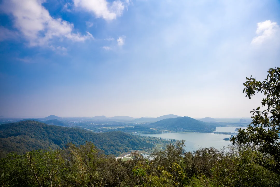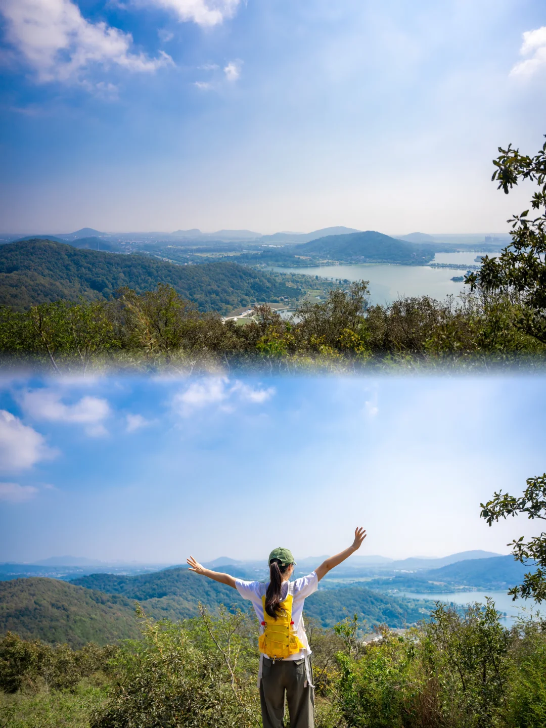 2. 观湖平台:能俯瞰整个南北湖,湖面波光粼粼,远处的山层叠起伏,阴天拍雾蒙蒙的水墨画感,晴天拍蓝天碧水超治愈