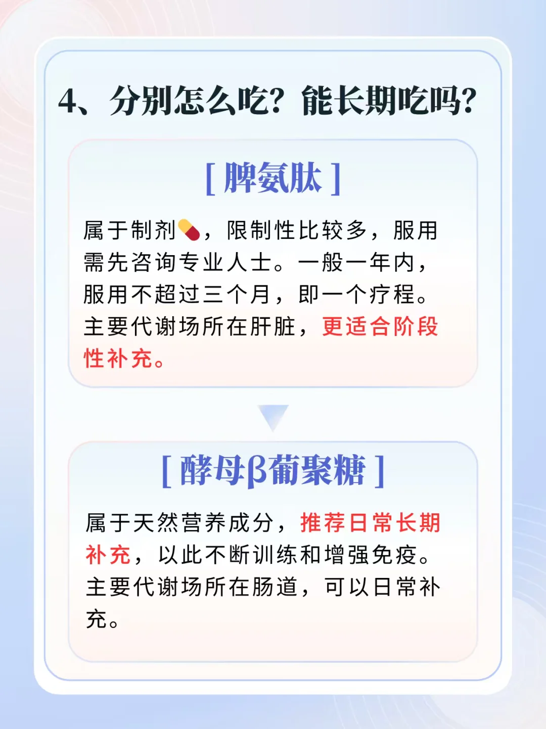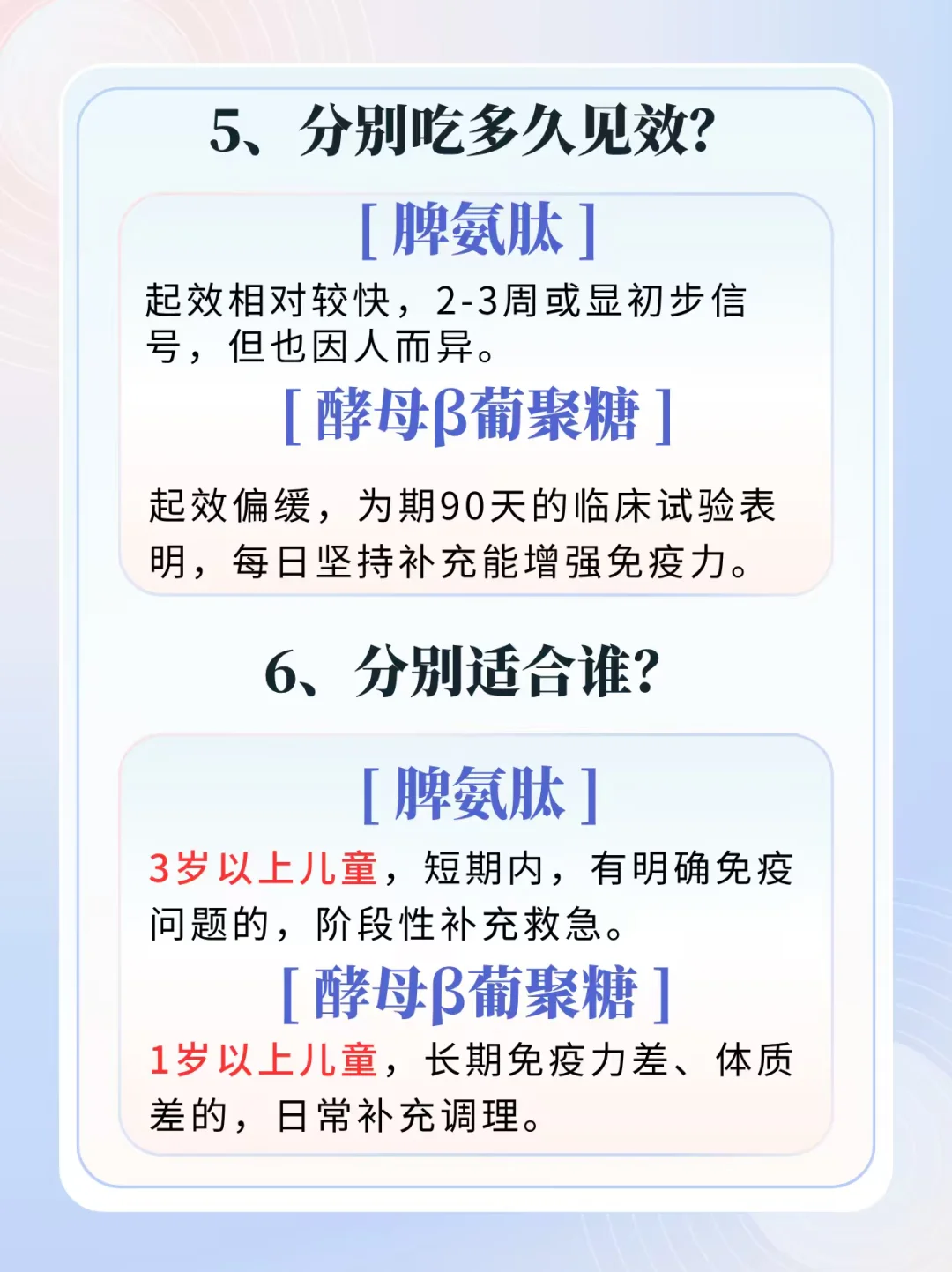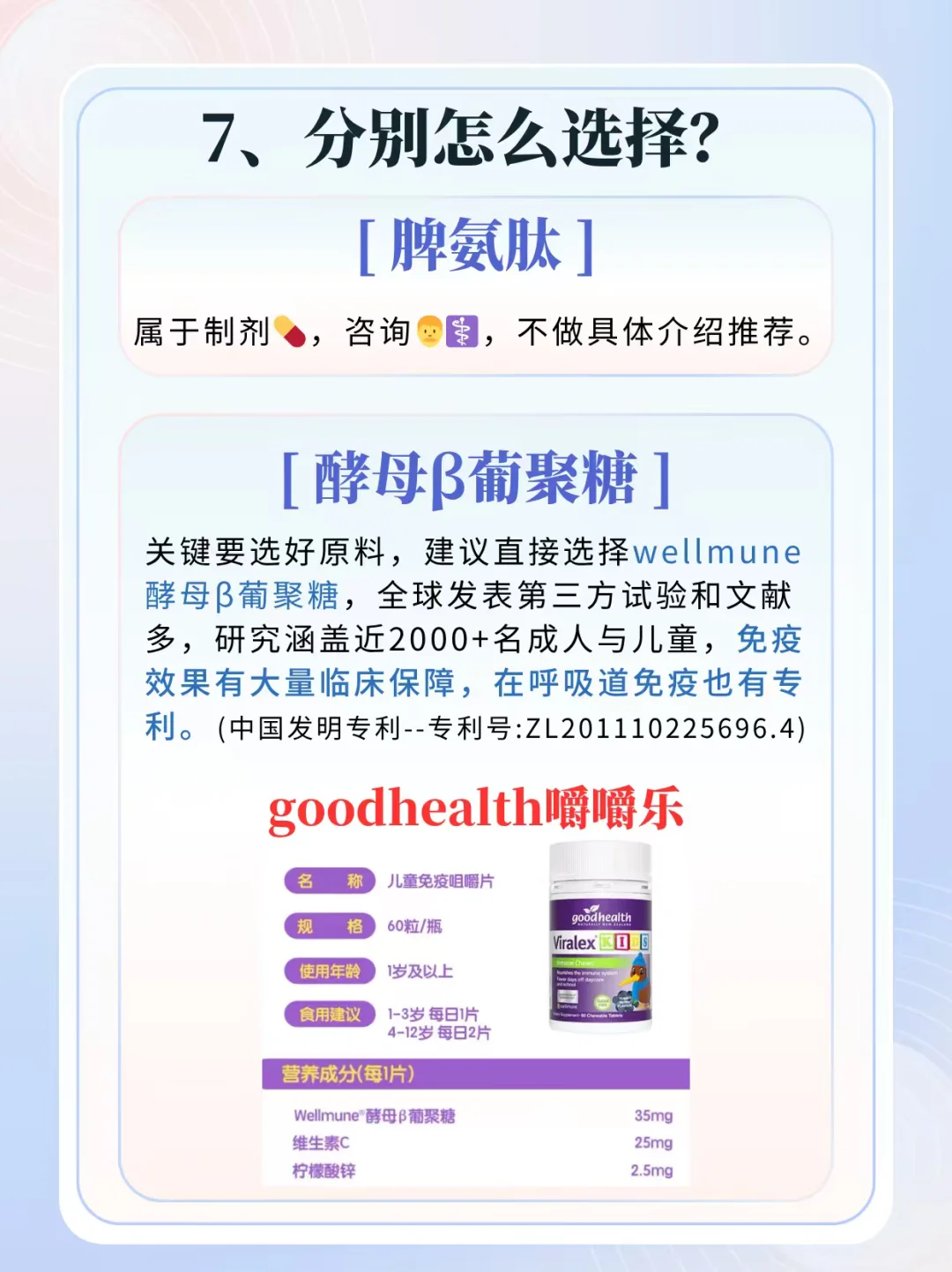 总体来说,儿童葡聚糖和脾氨肽都不是智商税,确实都对免疫力有一定帮助,但实际效果也因人而异。尤其脾氨肽,相关文献及临床研究比较少。如果真的想选择阶段性补充,也需要提前咨询专业人士。它属于制剂💊,服用的限制性比较多,可能出现一定的副作用。