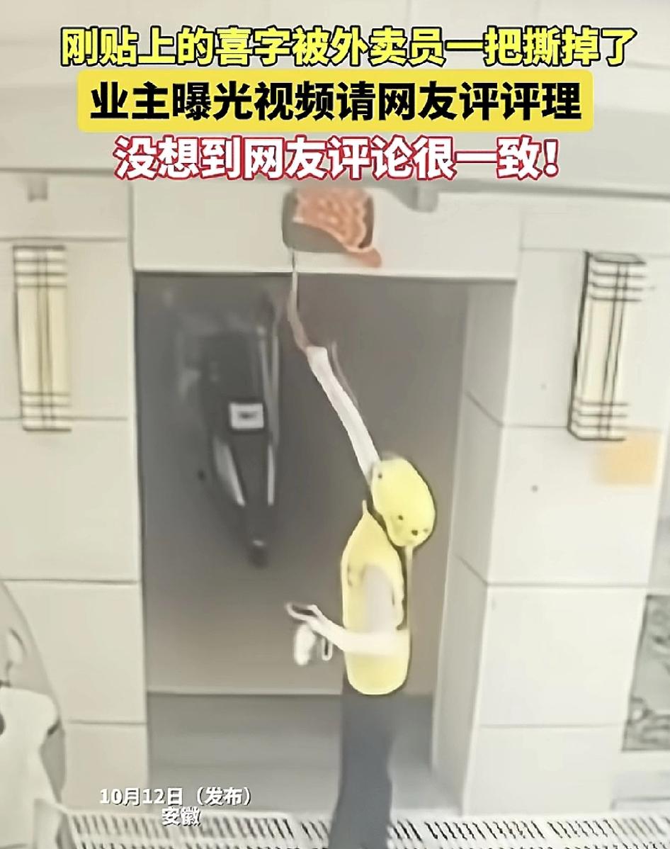 10月12日,安慰一位网友称自己所做的单元门口贴着一个“喜”字,但是被一名送外卖的人员手撕掉了,网友觉得外卖人员做的不对,但是网友们的评论通通支持外卖人员,原因是这张写字盖住了单元的门牌号,这是给多少人造成不便。贴这个字的人只有两个原因,一是心思不够仔细,还有就是完全不考虑别人过于自私的人。