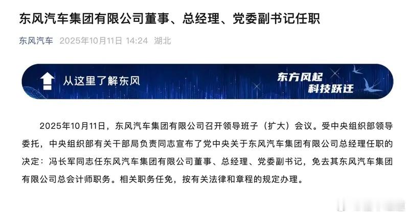懂车之道讯10月11日,东风汽车集团有限公司宣布,冯长军同志任东风汽车集团有限公