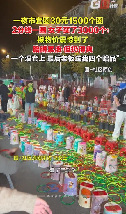 这老板真会做生意!10月5日,黑龙江齐齐哈尔,一女子前来旅游时,被夜市30元1500个圈的套圈摊所震惊,于是果断买了3000个圈,没想到,女子还是一个都没有套中!老板觉得过意不去,就送了她4个赠品。 山东的马女士来黑龙江齐齐哈尔旅游,10月5日晚上马女士和家人在逛夜市时发现,夜市上有个套圈摊30元1500个圈,当时马女士被这个价格震惊了,她掏出手机一算,平均每个圈才2分钱。 这年头哪还有这么便宜的套圈,别的地方少说也得一两块钱一个,贵的地方五块钱都不稀奇。 马女士看到摊位上摆满了各种小玩意儿,毛绒玩具、保温杯、钥匙扣、小风扇,还有些实用的日用品,看着挺诱人的,但明眼人都知道,套圈这玩意儿想中奖可不容易。 马女士心想这么便宜,不试试都对不起自己,她直接豪气地买了3000个圈花了60块钱,摊主从后面搬出两个大塑料筐,里面装得满满当当的都是红色塑料圈。 拿到圈后马女士和家人就开始套了起来,马女士发现这些圈比想象中轻多了,一扔就飘根本控制不住方向,再看看摊位上的东西,最近的也有两米远,远的得有三米多,这难度可不小。 前500个圈基本就是练手各种角度都试了就是套不中,慢慢地周围聚集了十几个看热闹的人,有人给她支招:您得瞄准了再扔别着急,还有人说:这圈太轻了得用点巧劲儿。 扔到1000个的时候,马女士已经有点找到感觉了,但还是一个都没中,胳膊开始发酸她停下来歇了会儿,喝口水继续战斗。 2000个圈过去了围观的人越来越多,有人开始录视频还有人在旁边起哄:加油啊姐,就差一点了,马女士这时候已经不是为了套中什么东西了,纯粹就是跟自己较劲。 最后1000个圈扔得飞快,实在是太累了,将近40分钟的时间,3000个圈全部扔完结果一个都没套中,这运气也是没谁了。 摊主看不下去了从货架上拿了4个小礼品塞给马女士,两个钥匙扣,两个小摆件,虽然不值什么钱,但这份心意让人暖心。 马女士把这次套圈的经历拍成视频发布到了网上,网友们在评论区炸锅了,有网友说这老板太会做生意了,虽然没让顾客套中,但最后送礼品这一手绝了,顾客不会觉得亏,反而会记住这个摊位的好。 也有网友留言道:这是在哪,我也要去体验一下,不是为了套中东西,就是想体验一下,扔套圈累着的感觉。 齐齐哈尔当地人透露,这个摊主在夜市摆摊好多年了,一直都是这个价格,靠的就是实在从来不坑人,虽然圈轻了点距离远了点,但价格摆在那儿,谁也说不出什么。 马女士说道:虽然一个都没套中,但这次经历挺有意思的,60块钱买了个快乐,还认识了这么实在的摊主值了,她还说下次再去齐齐哈尔,一定还要去这个摊位玩。 齐齐哈尔这个套圈摊主真会做生意,把套圈玩出了新高度,不仅让顾客体验到了套圈的快乐,自己也挣到了钱,简直就是双赢。 麻烦看官老爷们右上角点击一下“关注”,既方便您进行讨论和分享,又能给您带来不一样的参与感,感谢您的支持!