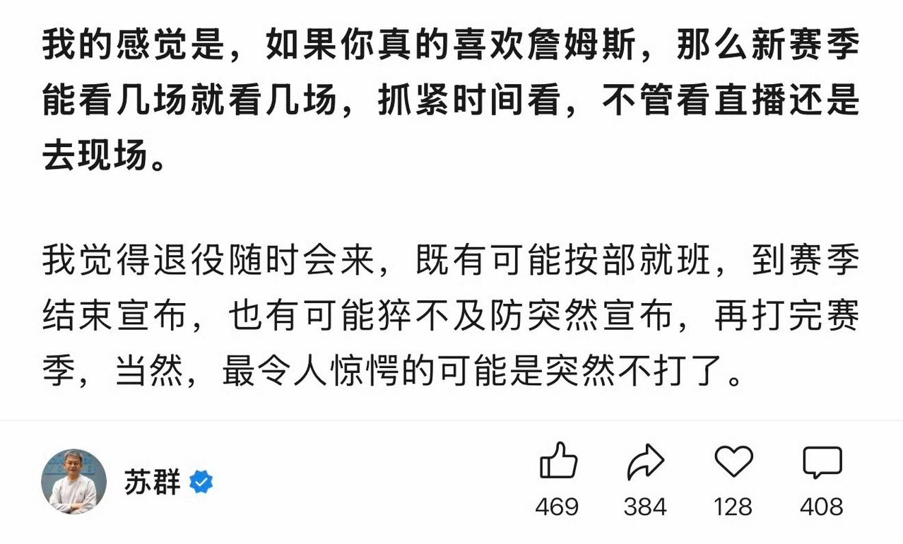苏老师的眼光是不会错的,依老詹这种性格,是不会让湖人占便宜的。退役巡演说白了就是