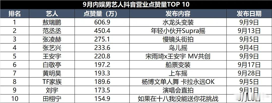 9月内娱男艺人🫘营业点赞量TOP10敖子的气质抽象接地气确实适合🫘[笑cr