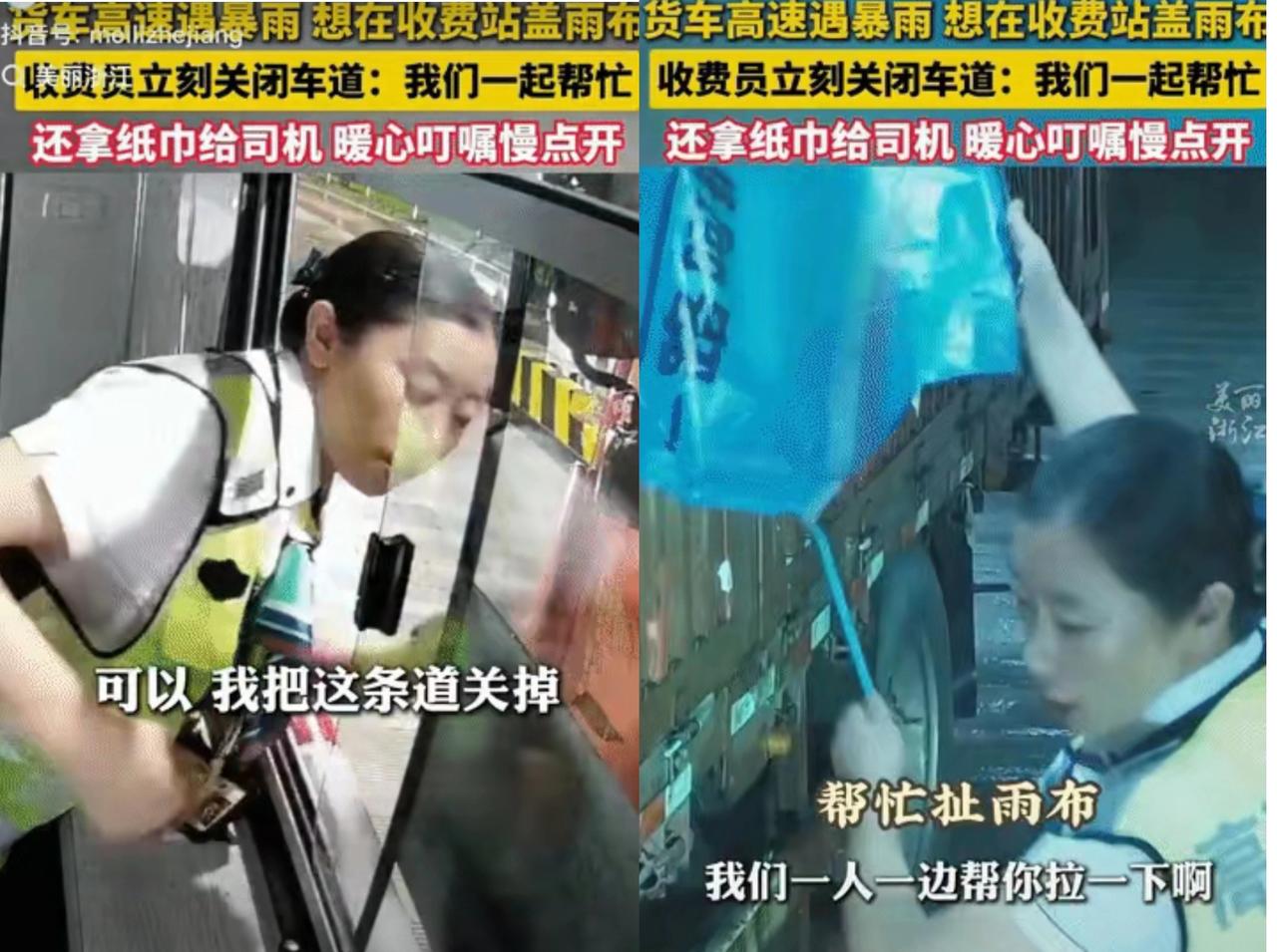这位美女收费员要火! 浙江杭州,一货车高速遇暴雨, 想在收费站盖雨布,收费站立刻