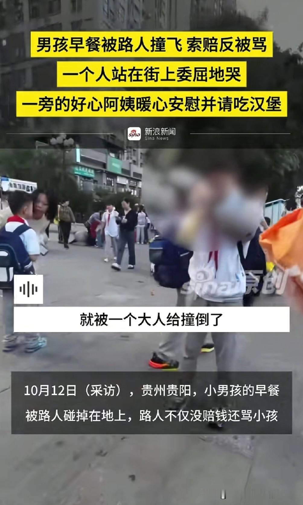 挺大的人欺负小学生, 这是活不起了吗欺负小学生, 10月11号在贵州贵阳某小区门口,这条路是去小学的必经之路,卖东西的比较多,早上人流也比较大。 有一位男同学买的早饭边走边吃,突然被一些大人给撞到了,小男孩的早饭也掉地上了,人也摔到了。 大人一句道歉没有直接就走了,小男孩连忙站起来拦住大人不让他走,让他赔自己早饭,大人不但没有赔偿小男孩的早饭,还骂小男孩。 这种人也只会欺负小孩子,但凡小男孩身边有家长他都不敢说话,这种人在家里也没有什么地位,就是被欺负惯了,只能拿小孩子撒气! 小男孩都气哭了,不知道该怎么办,还好路边有位卖汉堡的阿姨看到了,连忙询问小男孩怎么了。 小男孩就把事情告诉了卖汉堡的阿姨,小孩子不吃早饭上午怎么上课,阿姨心疼小男孩就安慰小男孩,还给小男孩一个汉堡,让他当早饭吃。 相信小男孩以后作文里,肯定有这位卖汉堡阿姨的身影,一个小小的举动温暖了小男孩的童年! 还记得今年暑假在贵州,三位小孩卖雪糕,有位大人也是吃了小孩的雪糕不愿意给钱,最后还是饭店老板娘给的,这个世界还是好人多!
