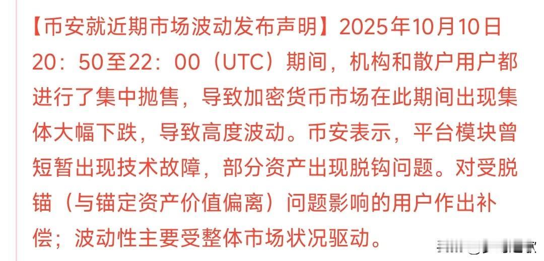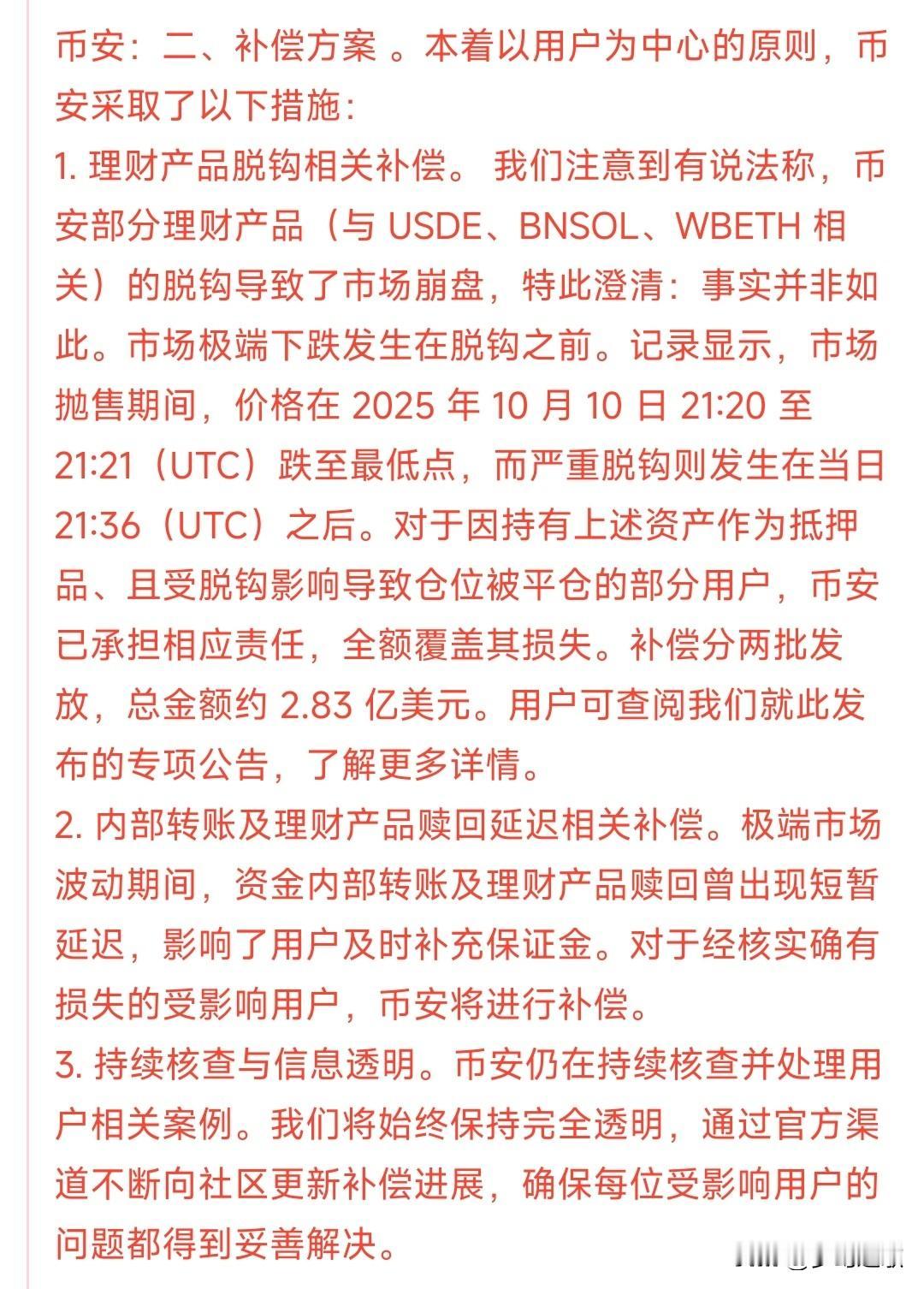 币安就因发生的技术问题对投资金进行加密货币的补偿出来了 币安此次补偿的品种包括Ethena的稳定币USDe、币安发行的Solana流动性质押代币BNSOL,以及Wrapped Beacon流动性质押代币WBETH。 这种技术问题确实是平台出现了错误造成了投资者的大量损失,币安处理的还算及时,总补偿达到了2.83亿美元。 对于爆仓的投资者来说虽然不能全部挽回损失,但也能拿到一部分资金,短期可以解渴。 极端的行情遇到技术故障,这个确实闹心,希望以后不会再出现这种情况。
