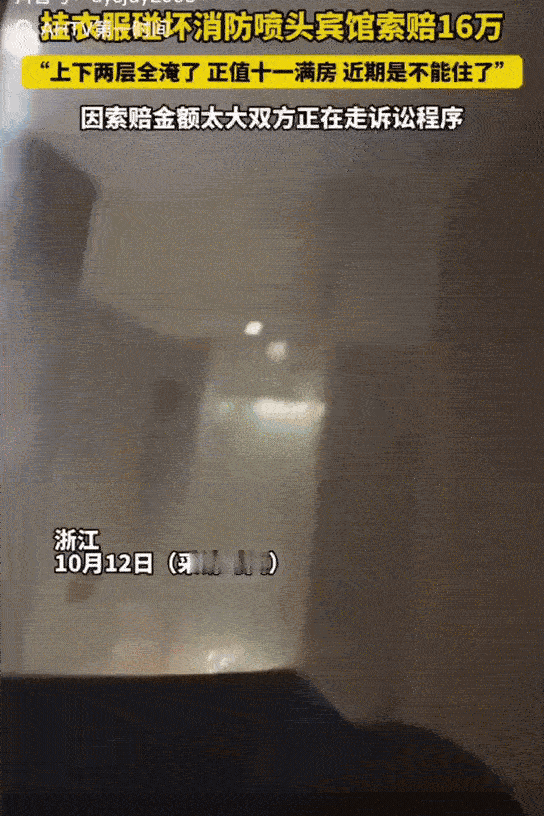 “万万没想到!”浙江,国庆假期,一位顾客,住宾馆的时候,只是挂了个衣服,直接给宾馆造成了16万的损失。 国庆假期,宾馆住满了顾客,一位顾客洗了件衣服,他左找右找,总算找到了个挂衣服的地方。他竟然挂到了消防喷头上,把消防喷头的玻璃丝弄断了,直接触发了消防喷淋设施。 虽然及时把消防阀门关了,但是管道里的水要都流完。流出来大约10吨水,把宾馆上下两层都淹了。抽水泵抽了一夜。 由于正是旅游旺季,宾馆满员,所有顾客都要退款,宾馆短期内不能营业。顾客的这一举动造成了16万元的经济损失。但是,这名顾客不认可这个赔偿数额。宾馆老板准备走诉讼程序。 我最近看了《我在北京送快递》这本书,作者也提到一个故事。他的同事把快递放进消防栓的时候,不小心弄坏了阀门,漏水了。水流进电梯,造成电梯损坏,赔了3万块。 我们小区有个大爷,打开井盖,想接水浇花,也把消防阀门弄坏了。造成小区停水6小时,被物业罚了5000元。 大家还是要少碰公共设施,尤其是不了解的设备。因为挂了个衣服,就造成这么多损失,实在不值得。 不知道这位顾客,当时怎么想的,现在估计肠子都悔青了吧?