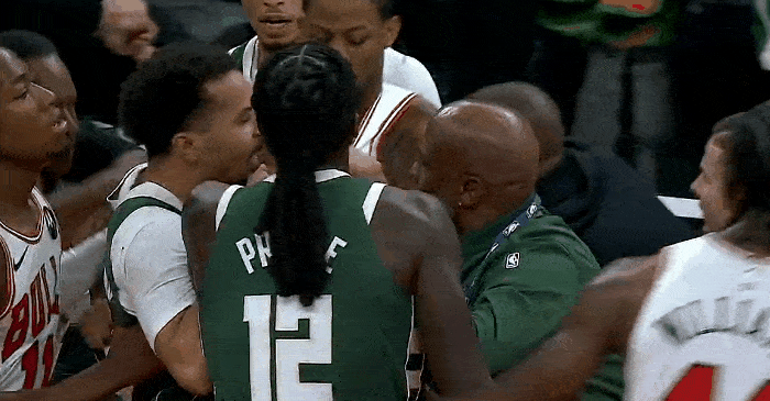 打起来了!这科比正赛好看太多了! 在今天NBA季前赛雄鹿对阵公牛的第四节比赛中,普林斯防守中一把将对手拉下,公牛众将见状立刻与其理论,达伦·特里更是直接锁喉普林斯! 随后双方球员陆续加入其中,场上局面一发不可收拾,最终裁判会看后直接将特里驱逐,而始作俑者普林斯则领到了一个技术犯规!