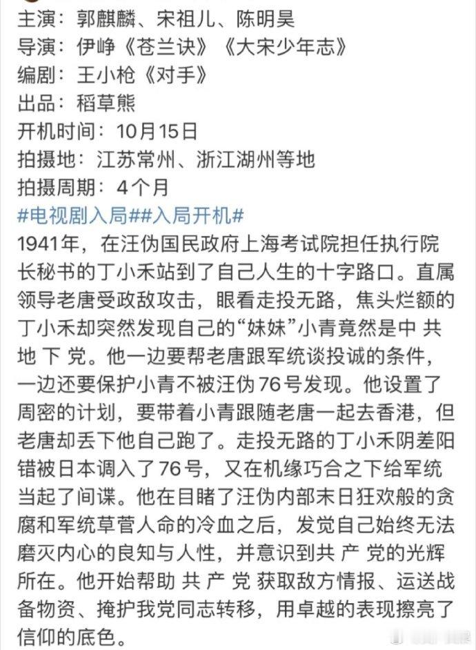 郭麒麟宋祖儿新剧演兄妹,《入局》1015 开机,故事以上海孤岛时代为背景,兄妹在家国危局中的抉择成剧情核心。郭麒麟宋祖儿新剧演兄妹郭麒麟宋祖儿入局1015天津开机