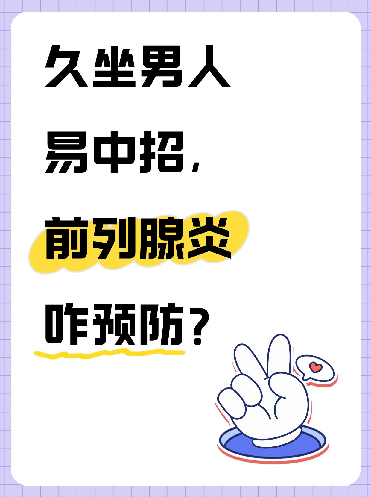 如何预防前列腺炎的发生? 对于前列腺炎这个问题很多人并不陌生,一旦它发炎了必然会让你非常痛苦,假如持续性的发炎就会非常影响你的生活质量。 前列腺炎这个器官虽然很小,但是它的位置比较重要,尿道贯穿于它,所以它的肿大,发炎,结节必然会影响排尿。要么尿频,明明没有多少尿但是就是想去厕所,要么总是感觉会阴追涨,经常性的刺痛。那么我们平时有什么好的方法来预防前列腺炎呢? 首先,我们不要久坐,假如久坐的时间比较长就会让前列腺持续性的充血,进而会导致发炎。 其次,不要纵欲过度,或者手瘾过度,这些也会让其充血进而发炎。 第三,不要胡吃海喝,油腻辛辣甜食大鱼大肉少吃而不是不吃,吃的过多伤脾胃,会导致体内痰湿过重,为前列腺炎的发生提供了土壤。 第四,平时需要保持良好的情志,假如情志不畅就会导致气滞血瘀,前列腺局部气血就会流通不畅就会有瘀血的产生。 所以我们要像对待客人一样对待前列腺,不然它的发炎必然会让你不舒服。当然假如前列腺总是反复的发炎,这个时候你要知道不仅仅消炎,还需要扶正。