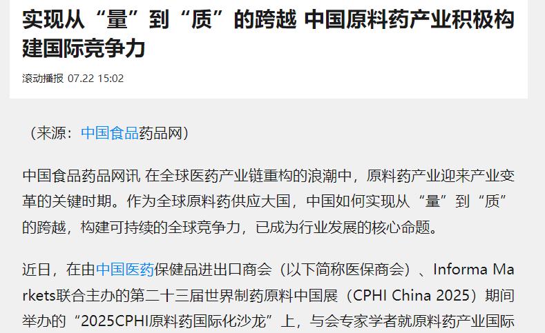 美媒发现不对劲了! 除了稀土以外,中国手里还有一张王牌没用,那就是美国的医药供应链。这张医药牌才真叫致命,美国的救命药原料几乎全攥在咱们手里! 可能很多人不清楚,原料药是药品生产的“地基”,就像做饭得先有米和面,生产各种药品也离不开原料药,而我们在全球原料药市场早就站稳了脚跟。 根据中国医药保健品进出口商会的最新统计,中国原料药出口量占全球市场的60%以上,不少关键品类更是几乎被中国“包圆”。 比如常用的青霉素类原料药,中国产量占全球80%多;维生素C这类日常补充剂的原料药,中国市场份额甚至超过90%。 这些原料看着普通,却是从感冒药、退烧药,到高血压、糖尿病等慢性病特效药,再到手术中必须用的抗生素的“起跑线”,少了它们,很多药品根本造不出来。 美国食品药品监督管理局(FDA)曾发布报告明确说,美国近40%的处方药原料都得靠进口,其中像抗生素、激素类药物这些关键药品,对中国原料药的依赖度超过80%。 这意味着,要是中国原料药供应出点波动,美国的医药体系就得紧张。 有行业调研显示,现在美国药企的原料药库存大多只能撑3到6个月,要是供应链真的断了,用不了多久,美国药店货架上的不少救命药可能就会告急,这对美国医院的诊疗和老百姓的健康影响可太大了。 更重要的是,原料药生产不是随便搭个厂子就能搞的,得有过硬的技术、严格的质量控制和齐全的资质,建立完整的生产体系需要好几年甚至十几年的投入。 美国这些年也想把原料药生产迁回本土,但一直进展缓慢,毕竟中国经过几十年发展,已经形成了从研发、生产到运输的完整医药产业链,不仅成本控制得好,质量也稳定,这些优势不是短时间能追上的。 不过我到是奉劝美媒别那么担心,我们虽然握着这张王牌,却从来没主动把它当“武器”用。 我们一直遵守国际贸易规则,稳稳当当保障全球医药供应链的稳定,因为医药关乎全人类的健康,不是用来较劲的东西。 这张牌的威力美国人清楚但我们更清楚,维护供应链稳定是各国的共同责任,除非有国家不想让我们过好日子,否则我们不会轻易动用。