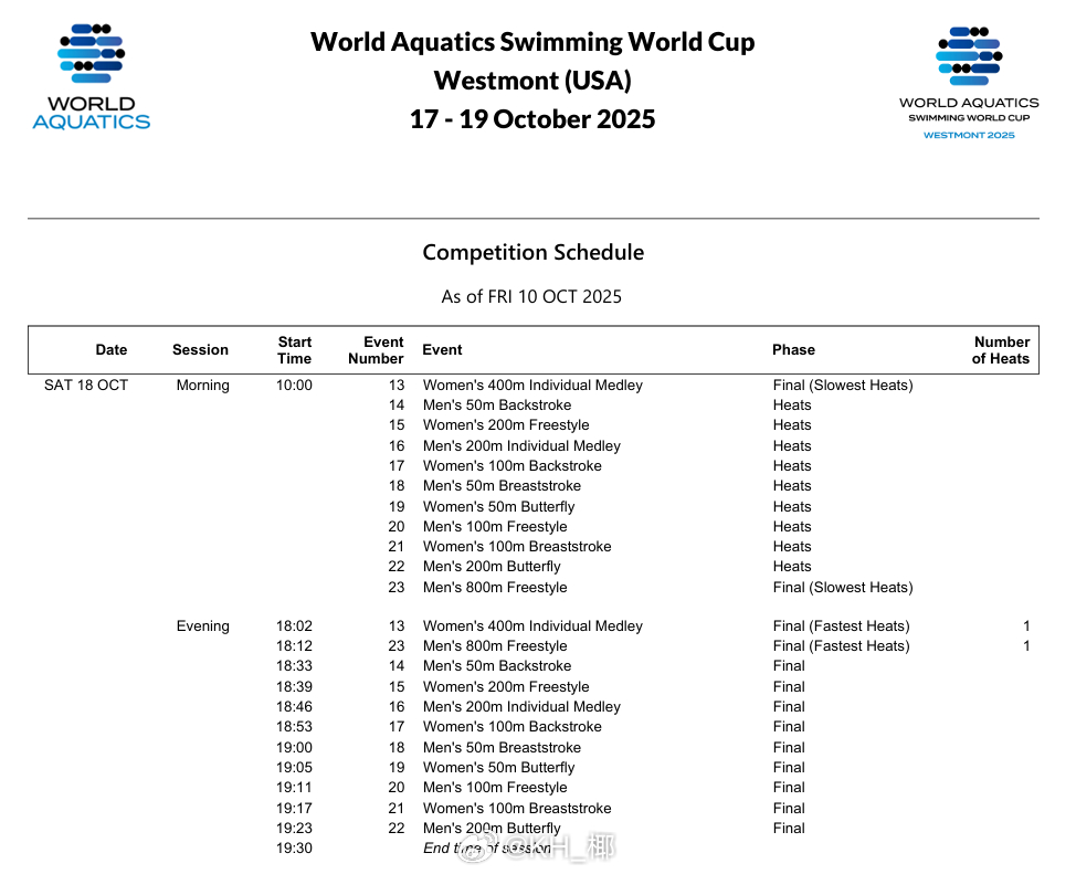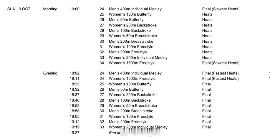 短池游泳世界杯维斯蒙特站 (10.17-19)赛程预赛北京时间23:00开始,决