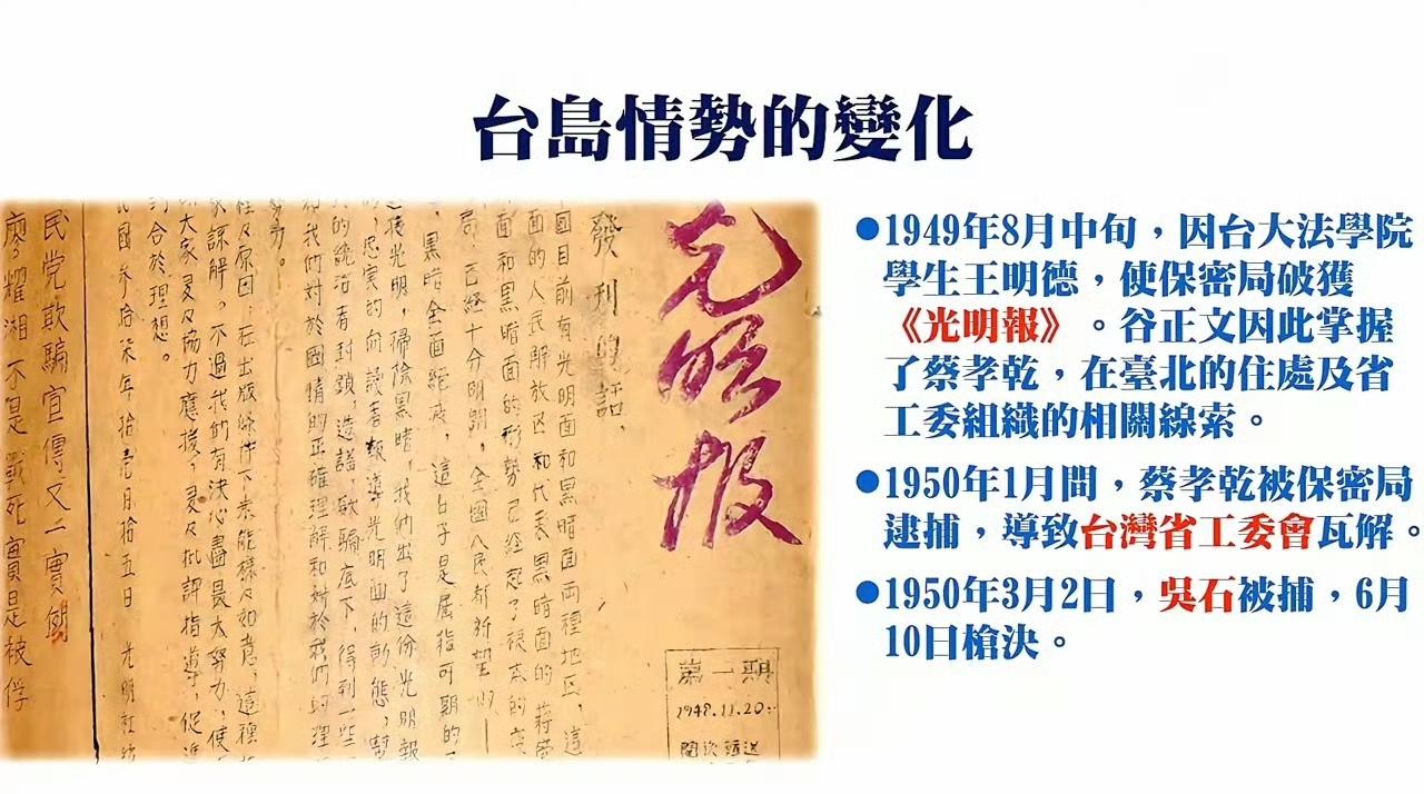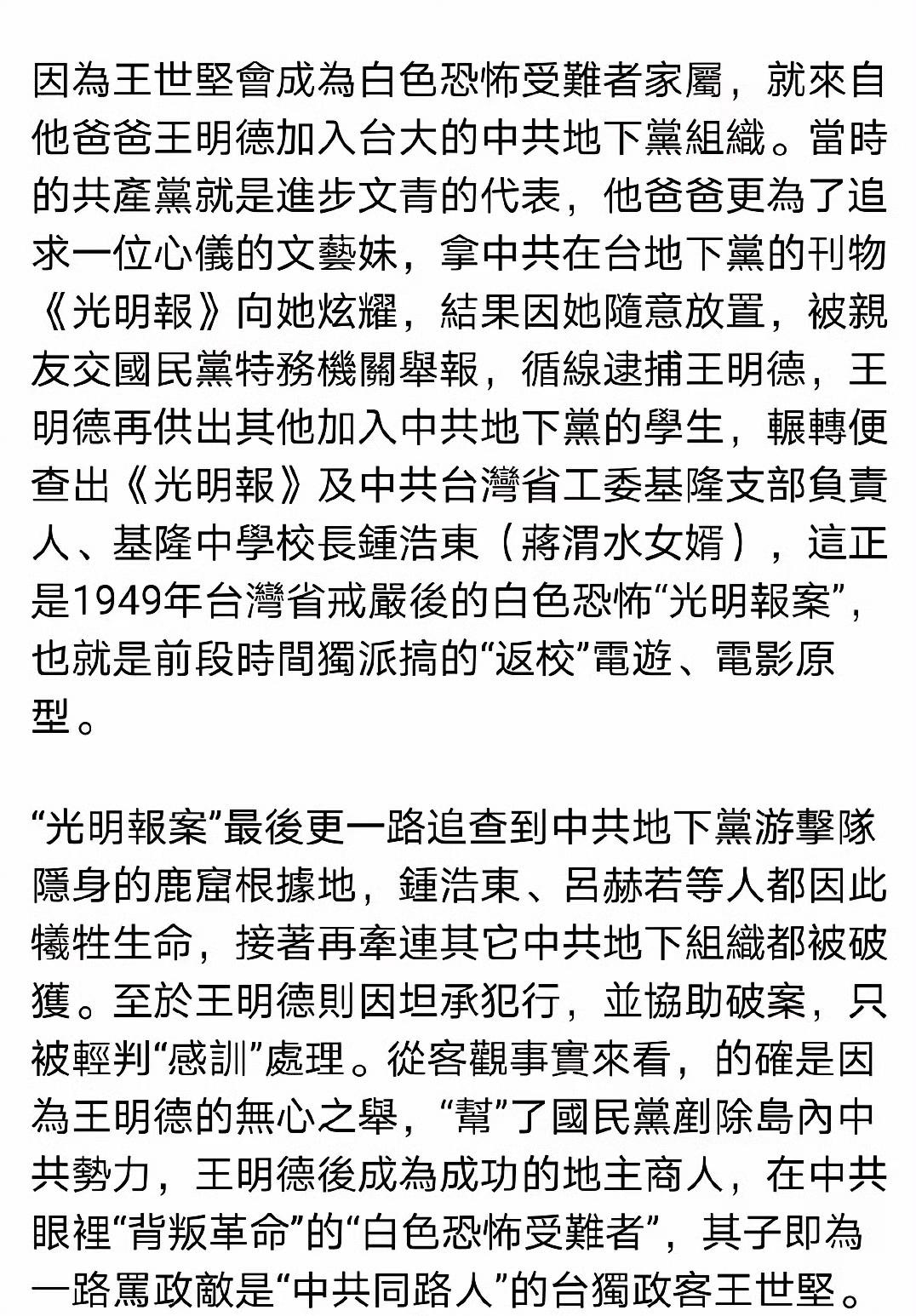 一首歌带火的不仅是王世坚,还有他父亲王明德的白色恐怖往事 最近,王世坚凭一首《没出息》在网络上爆火,热度一路发酵,意外把他父亲王明德的不堪过往也推到了公众眼前。王明德人生中藏着一段与台湾白色恐怖深度绑定的沉重记忆——1949年的“光明报案”。更关键的是,这场案件还间接牵出了中共台湾省工委负责人蔡孝乾的落网,最终酿成了波及更广的悲剧。 早年间,王明德也曾怀揣理想加入中国共产党,在台湾秘密从事地下工作。那份名为《光明报》的刊物,是他和同志们传递信念、联络信息的关键载体。那时候国民党在台湾管控极严,地下党员的每一次行动都像在刀尖上走,《光明报》更是绝对不能暴露的核心秘密。可王明德却因为一段私人情感,亲手打破了这份安全。 1948年,为了向心仪的姑娘炫耀自己的“特殊身份”,王明德把《光明报》随意交给了对方。姑娘没意识到这份报纸的分量,随手放在了家里,结果被亲友发现后直接举报给了国民党特务机关。 特务顺着线索很快抓到王明德,起初他或许还想硬扛,但在威逼利诱下,为了活命,他彻底松了口。他不仅供出了台大法学院支部、基隆中学支部的同志名单和活动地点,还提到大同中学教师季法与中共台湾省工委负责人“老郑”有关。 这一句供词,成了特务追查“老郑”的重要线索。而“老郑”,正是当时中共台湾省工委的核心人物蔡孝乾。1950年1月29日,特务根据线索在蔡孝乾的住所蹲守,成功将他逮捕,不过蔡孝乾后来趁乱逃脱。 要命的是,特务在蔡孝乾住处搜出的笔记里发现了“吴次长”三个字,矛头直接指向了时任国民党“国防部”参谋次长的吴石,导致吴石身份暴露。 两个月后,躲在嘉义农村的蔡孝乾因为不习惯农村生活,穿着西装去镇上吃西餐,再次被特务识破并逮捕。这一次,他没再抵抗,当场叛变,把台湾工委下属的所有组织、成员信息全盘托出。 这边,王明德的背叛已经让台大法学院支部、基隆中学支部遭了灭顶之灾。特务顺着他给的线索上门抓人,学生、老师一个没跑掉,一大批共产党员没能熬过迫害,最终丢了性命。那边,蔡孝乾的叛变更是让台湾地下党组织彻底崩塌,整个工委系统被连根拔起,无数党员和进步人士被捕遇害,白色恐怖的阴影瞬间笼罩了整个台湾。 后来王明德苟活到2009年,蔡孝乾也在叛变后得以善终,但那些因他们而牺牲的烈士,却永远停在了那个黑暗的年代。 接下来我将和大家聊聊“光明报案”里几个关键人物的经历,欢迎大家继续留意阅读。关注@体元讲古轩 ,下一篇更精彩。