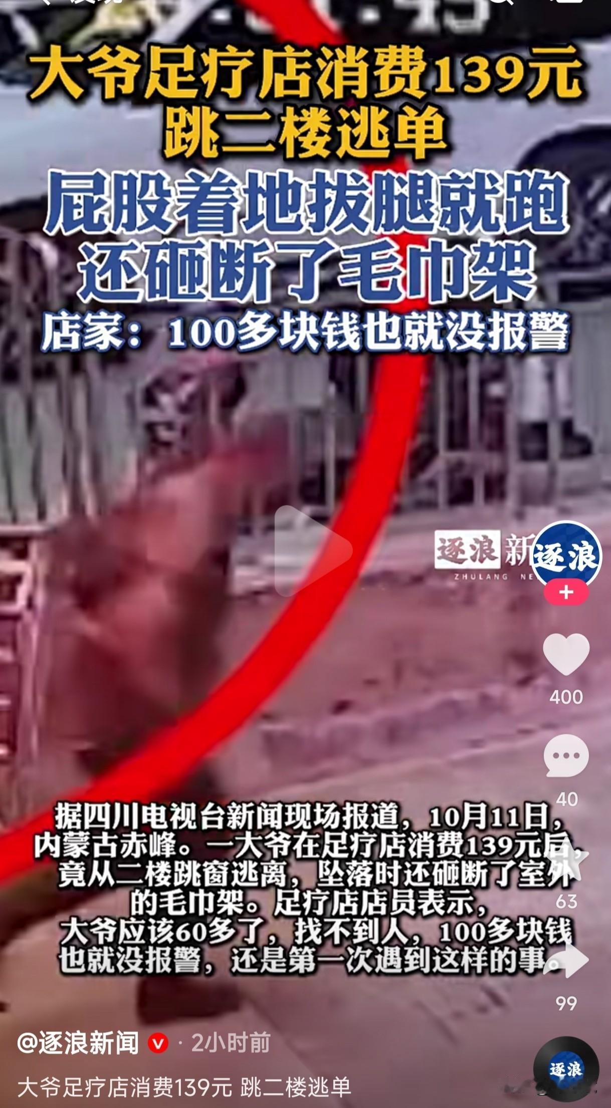 内蒙古赤峰一60岁大爷在足疗店消费139元后,居然从二楼窗户跳下逃单,掉下去还砸断了室外放的毛巾架,大爷起来拔腿就跑。 店家第一次遇到这样的事也很吃惊,100多块也没有多少,所以也就没有报警,这大爷居然因为一百来块钱从二楼窗户跳下去跑了,这免费的足疗做的真是够刺激的,不知这大爷经常干这事?还是他做完足疗后实在是没有钱就跑了? 这大爷一把年纪了还挺耐摔的,索性并无大碍,这万一摔断胳膊腿了,或者是摔死了,这店家是不是必须少不了赔偿?毕竟是在足疗店里出的事,这逃单也就算了,还把自己给摔坏了,这不得把店家给讹死? 如果这大爷玩手机的话,他看到别人把他做完足疗从二楼跳下逃单的事发到网上,他心里是不是还挺乐呵的,没想到自己居然上电视了,这大爷一把年纪了居然学会逃单了,看来年轻人会的大爷也会,这干偷鸡摸狗的勾当是不分男女老少的不是吗?赤峰足疗