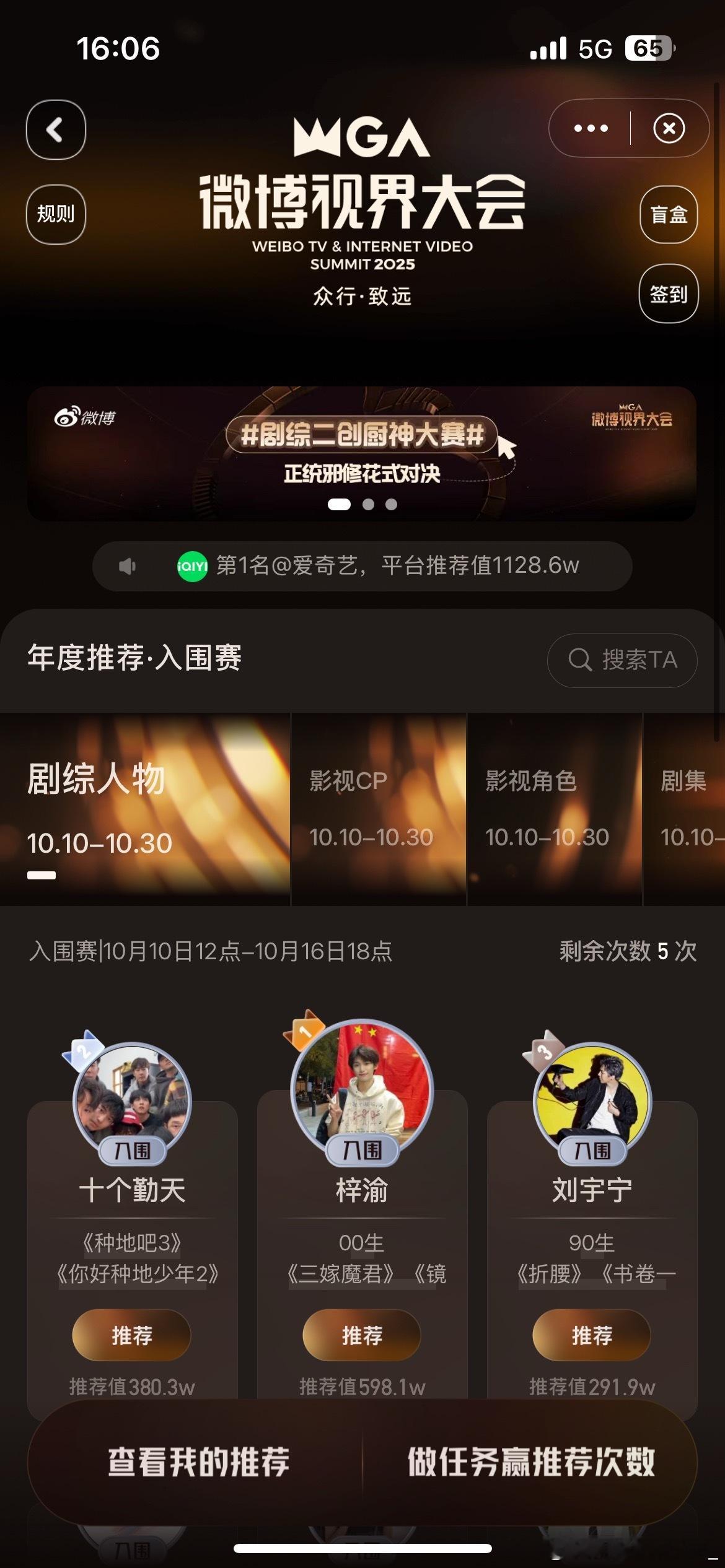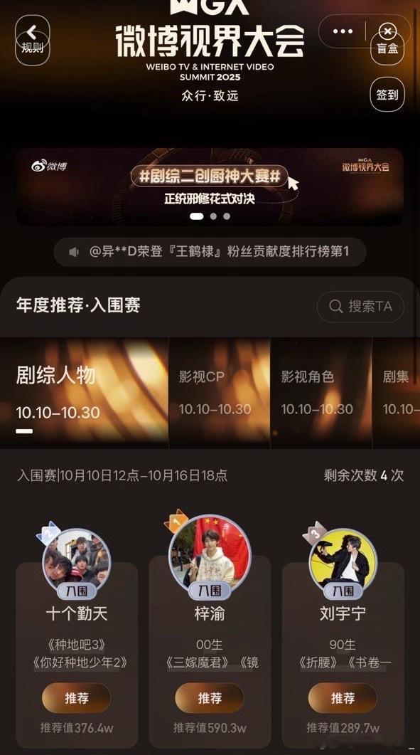 梓渝微博视界大会 剧综人物推荐值破600万了,感觉好突然啊,几天时间就到了