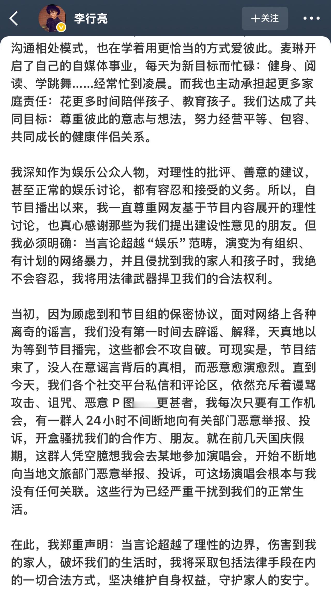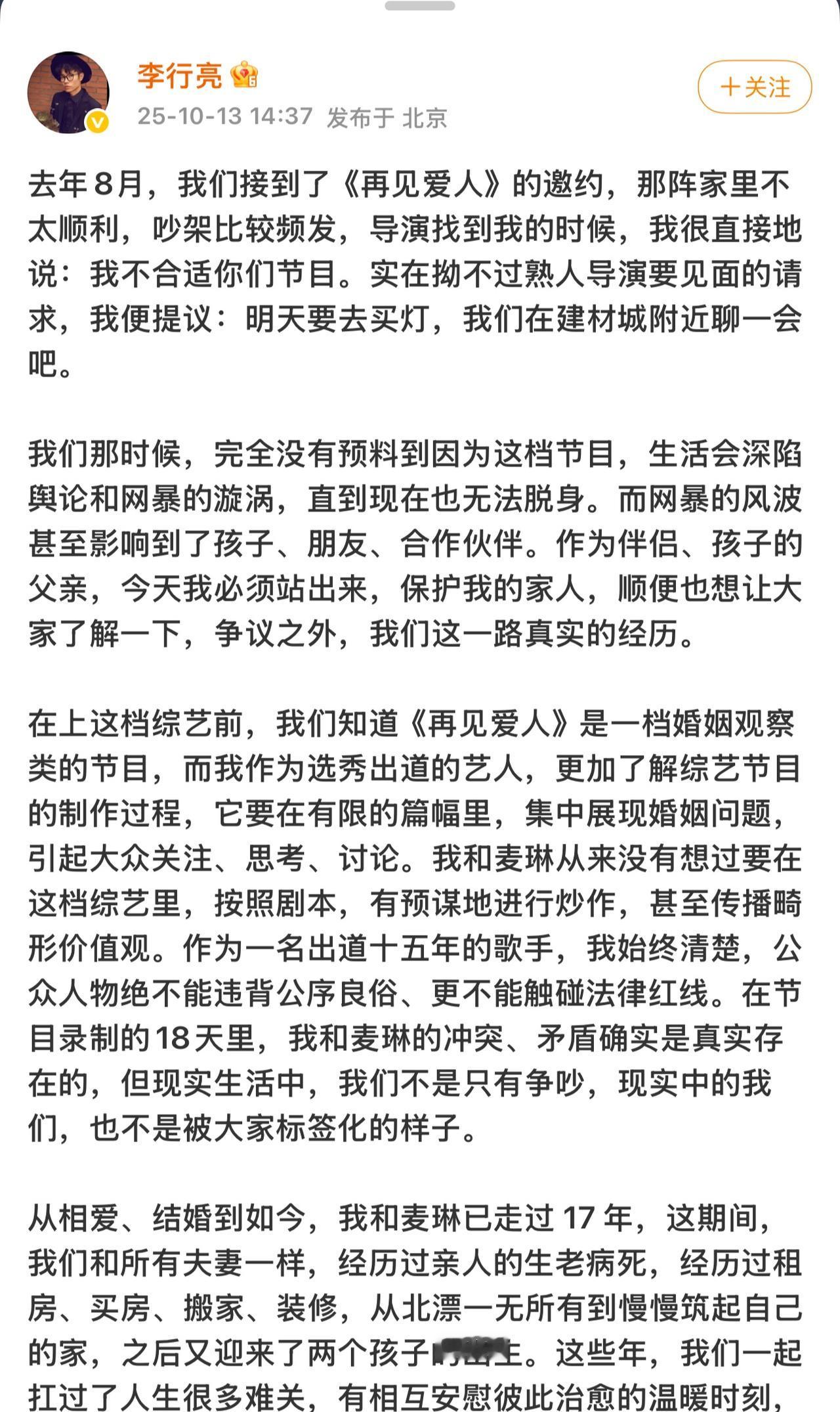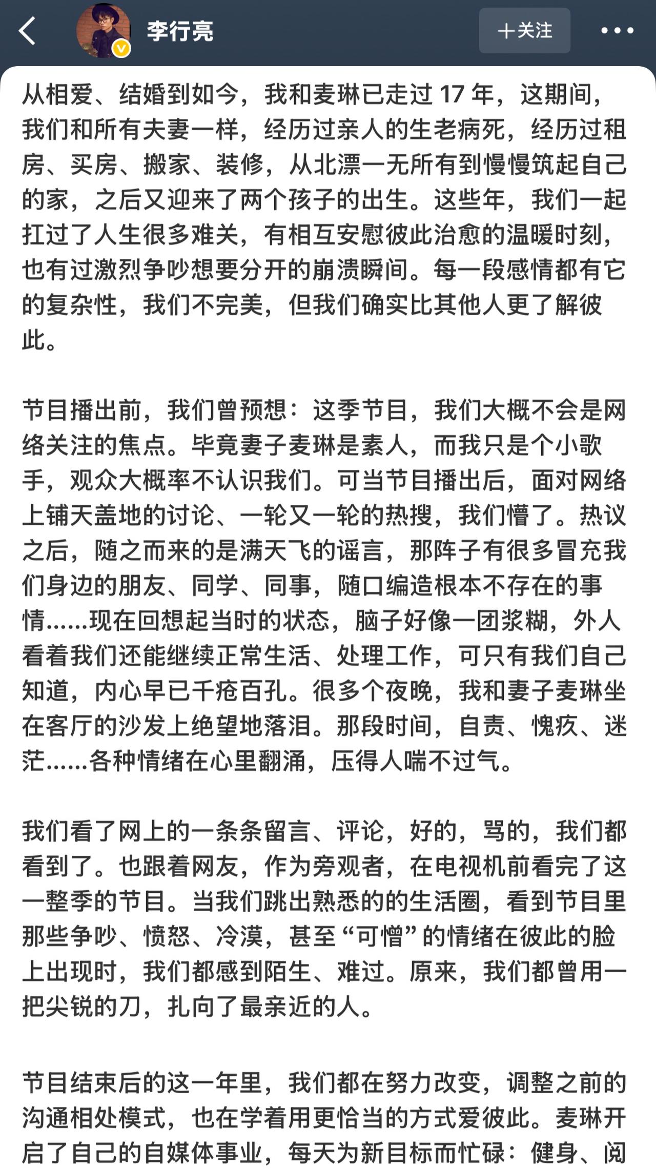 李行亮说当下生活如灾后重建。 还记得去年的《再见爱人》,麦琳和李行亮火了。 但是火的同时,却是无尽的烦恼。 近日,李行亮发微博长文进行维权。 因为节目后他遭受了谩骂以及无端的抵制,严重影响了他的声誉和正常生活,甚至还影响了孩子们的健康成长,为此他表示坚决维护其合法权益。 看了他的长文,感觉他确实深受其害,看来在节目上扒开自己的现状很不值得。