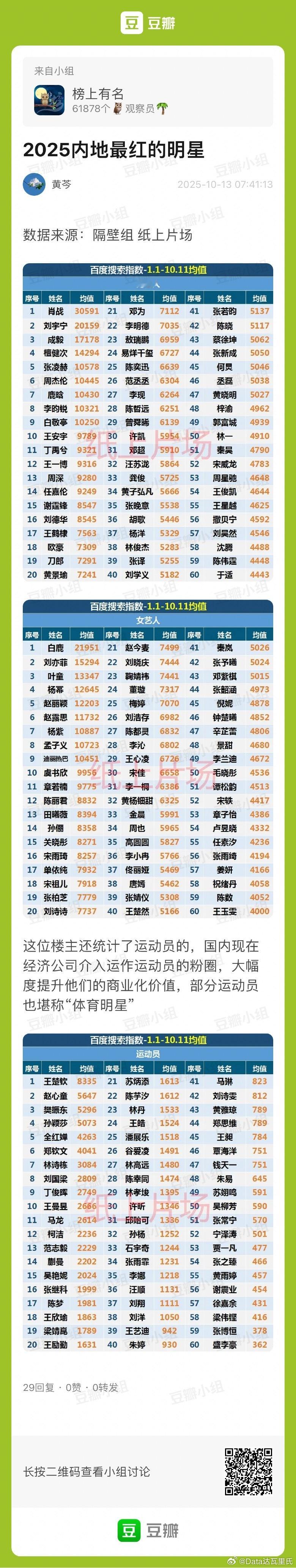 2025年内娱男女明星百指均值TOP60,符合你的体感吗?