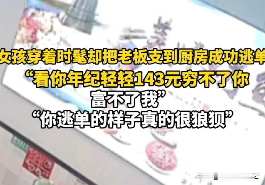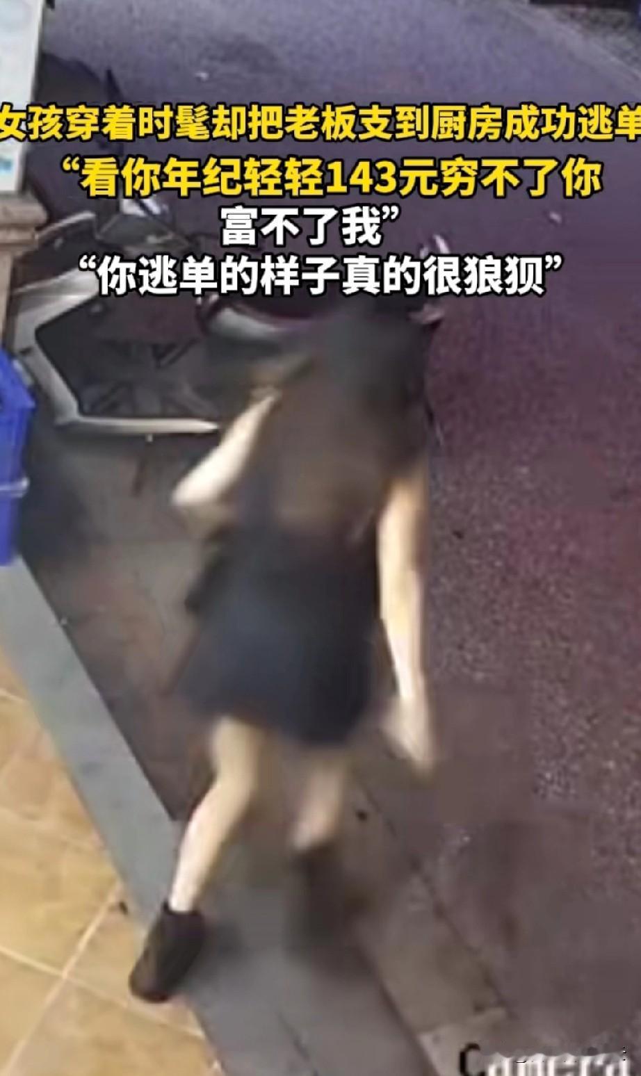 真丢人啊!打扮的时尚靓丽,也不像吃不起一顿饭的人啊,怎么就逃单了呢?现在被老板发出来了,以后在亲戚朋友面前,怎么混啊? 一家餐饮店老板放出一段店里女顾客逃单的视频,当时女顾客就一个人,点了一个类似小火锅的食物吧,桌上还喝了不少啤酒。 当时店里人不多,女顾客为了逃单故意指使老板上厨房给她拿白菜。老板刚一进厨房,女顾客顺手拿了几张抽纸后,撒腿就跑。 老板出来后一看没人了,就看视频,看到女顾客为了逃单故意支开他后,哭笑不得。老板说看她离开时的狼狈样,就觉得可笑。你说总共143块钱,你逃了也富不了,我少你一份也穷不了。如果有困难你可以说,何必弄的这么难堪呢? 看女孩的穿衣打扮,实在也不像付不起一顿饭钱的人。就算你真的付不起,可以和老板说声,我想老板也会给你碗面吃的。一个女孩子,消费了一百多块,这也不像遇到困难了。我看就是故意的。 对于这件事,你怎么看呢?