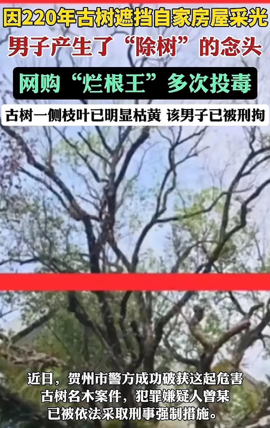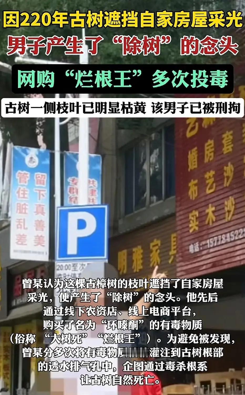 为采光毒杀220年古树?“私怨”犯了众怒,法律早有铁规 220年树龄的古樟树,熬得过风雨侵蚀,扛得住岁月变迁,却差点栽在一袋“烂根王”手里。只因枝叶挡住了自家采光,广西贺州男子曾某就动了歪心思——悄悄把剧毒的环嗪酮灌进古树根部的透气孔,盼着这棵“绿色地标”能“自然死亡”[__LINK_ICON]。可他没想到,这看似“悄无声息”的操作,不仅没瞒过园林巡护员的眼睛,更直接把自己送进了法网。 说起来,采光被挡确实闹心,换谁都可能有几句抱怨。但曾某的选择,藏着最可怕的人性误区:把个人便利凌驾于公共价值之上。这棵古樟树可不是普通杂木,它是从清朝活到现在的“活文物”,见证了两代人的出生长大,是周边居民的集体记忆,连树基都专门留了透水排气孔精心养护[__LINK_ICON]。可在曾某眼里,这些厚重的意义,竟抵不过几缕阳光的分量。 更讽刺的是,他还耍了“小聪明”:知道直接砍树违法,就网购“大树死”搞“暗箱操作”,以为能伪装成自然枯死蒙混过关。但法律从不会给这种“心机”留空子。最高法早就明确规定,不管古树是否列入保护名录,只要故意毁坏,就得依法定罪;要是情节严重,刑事处罚跑不了[__LINK_ICON]。之前江西四名男子毒死5棵古树,直接被判了两年多,网友都说“罚得对”,就是这个道理。 现在再看这起案子,更让人五味杂陈。园林部门为了救树,又是清除毒土又是注射解药,费了九牛二虎之力才稳住古树的衰败趋势;而曾某不仅要面临法律制裁,更要顶着邻里的指责——毕竟谁会容忍有人毁掉大家共同的念想? 其实这事本有更好的解法:找园林部门申请修剪枝叶,合理疏枝既能解决采光问题,又能让古树长得更健康。可他偏要选最极端的一条路,说到底还是“自私”在作祟。 这棵古树算是捡回了一条命,但它身上的“伤疤”该警醒所有人:那些存活百年的草木,从来不是私人的“绊脚石”,而是整个社会的珍宝。别让一时的私心,酿成无法挽回的过错,更别低估了法律守护“活文物”的决心。你觉得这种为了个人便利损害公共利益的行为,该严惩吗?古樟树 雷劈百年古树 新余古樟树 江永古樟树